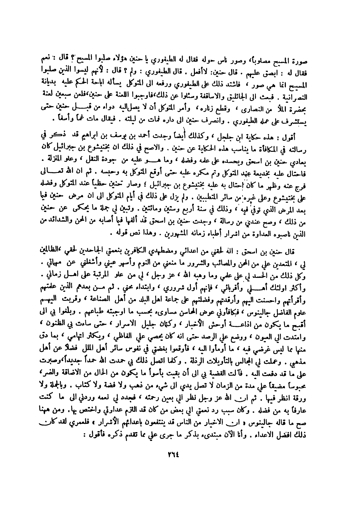 وَتبين لي جملَة مَا يحْكى عَن حنين من ذَلِك وَصَحَّ عِنْدِي من رِسَالَة وجدت حنين بن إِسْحَق قد ألفها فِيمَا أَصَابَهُ من المحن والشدائد من الَّذين ناصبوه الْعَدَاوَة من أشرار أطباء زَمَانه الْمَشْهُورين