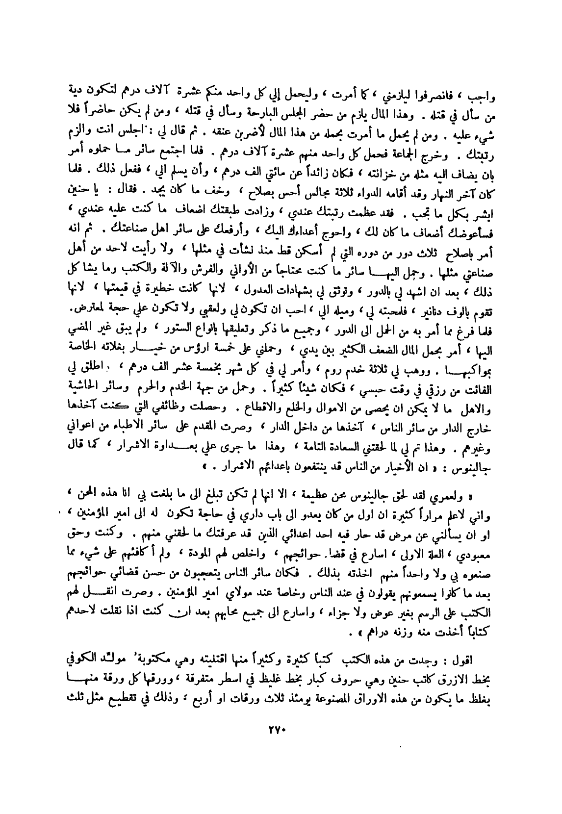 أَقُول وجدت من هَذِه الْكتب كتبا كَثِيرَة وَكَثِيرًا مِنْهَا أقتنيته وَهِي مَكْتُوبَة مولد الْكُوفِي بِخَط الْأَزْرَق كَاتب حنين وَهِي حُرُوف كبار بِخَط غليظ فِي أسطر مُتَفَرِّقَة وورقها كل ورقة مِنْهَا بغلظ مَا يكون من هَذِه الأوراق المصنوعة يَوْمئِذٍ ثَلَاث وَرَقَات أَو أَربع وَذَلِكَ فِي تقطيع مثل ثلث