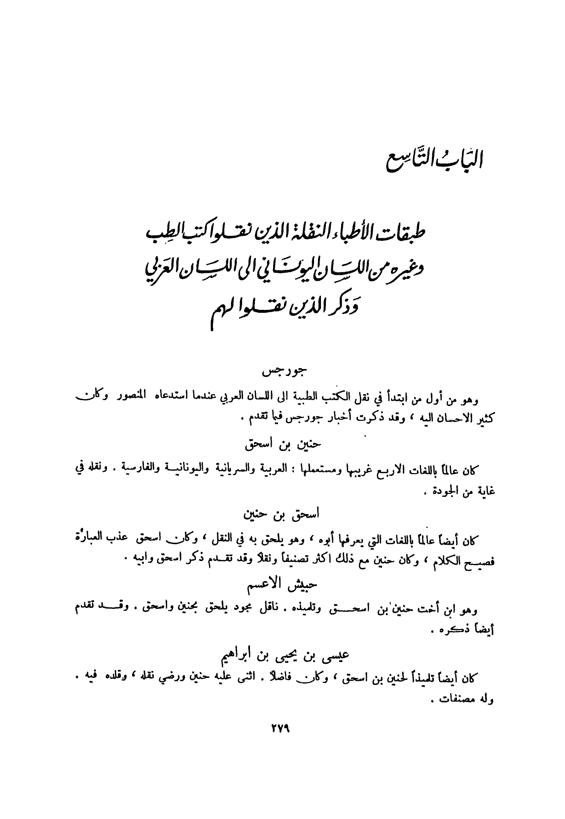طَبَقَات الْأَطِبَّاء النقلَة الَّذين نقلوا كتب الطِّبّ وَغَيره من اللِّسَان اليوناني إِلَى اللِّسَان الْعَرَبِيّ وَذكر الَّذين نقلوا لَهُم