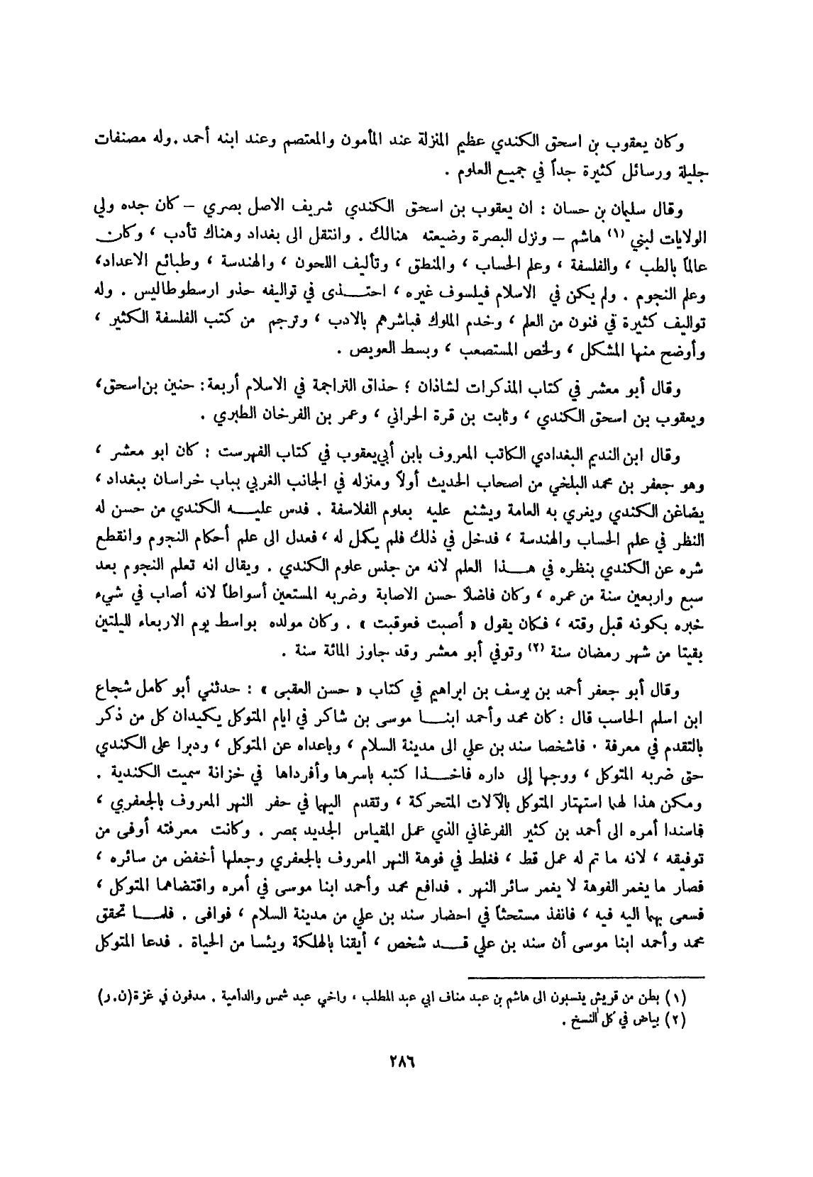 وَقَالَ أَبُو جَعْفَر أَحْمد بن يُوسُف بن إِبْرَاهِيم فِي كتاب حسن العقبى حَدثنِي أَبُو كَامِل شُجَاع ابْن أسلم الحاسب قَالَ كَانَ مُحَمَّد وَأحمد ابْنا مُوسَى بن شَاكر فِي أَيَّام المتَوَكل يكيدان كل من ذكر بالتقدم فِي معرفَة