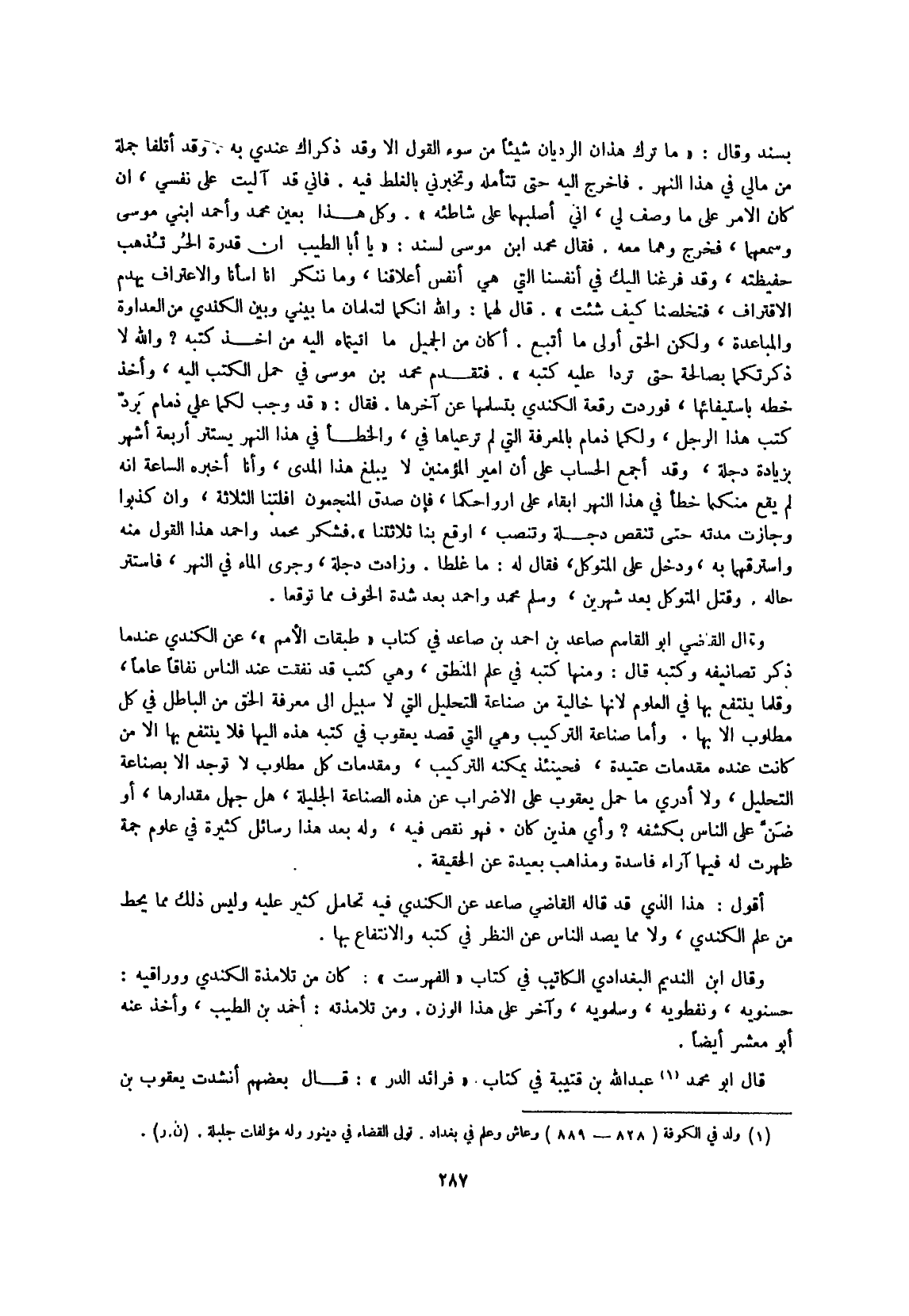 أَقُول هَذَا الَّذِي قد قَالَه القَاضِي صاعد عَن الْكِنْدِيّ فِيهِ تحامل كثير عَلَيْهِ وَلَيْسَ ذَلِك مِمَّا يحط من علم الْكِنْدِيّ وَلَا مِمَّا يصد النَّاس عَن النّظر فِي كتبه وَالِانْتِفَاع بهَا