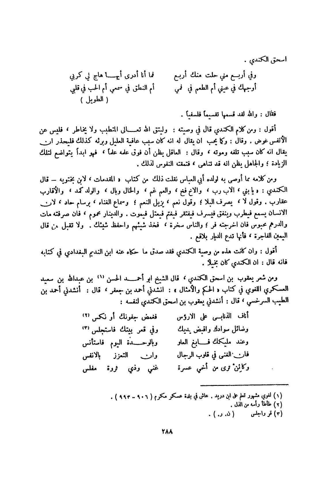 أَقُول وَإِن كَانَت هَذِه من وَصِيَّة الْكِنْدِيّ فقد صدق مَا حَكَاهُ عَنهُ ابْن النديم الْبَغْدَادِيّ فِي كِتَابه فَإِنَّهُ قَالَ إِن الْكِنْدِيّ كَانَ بَخِيلًا