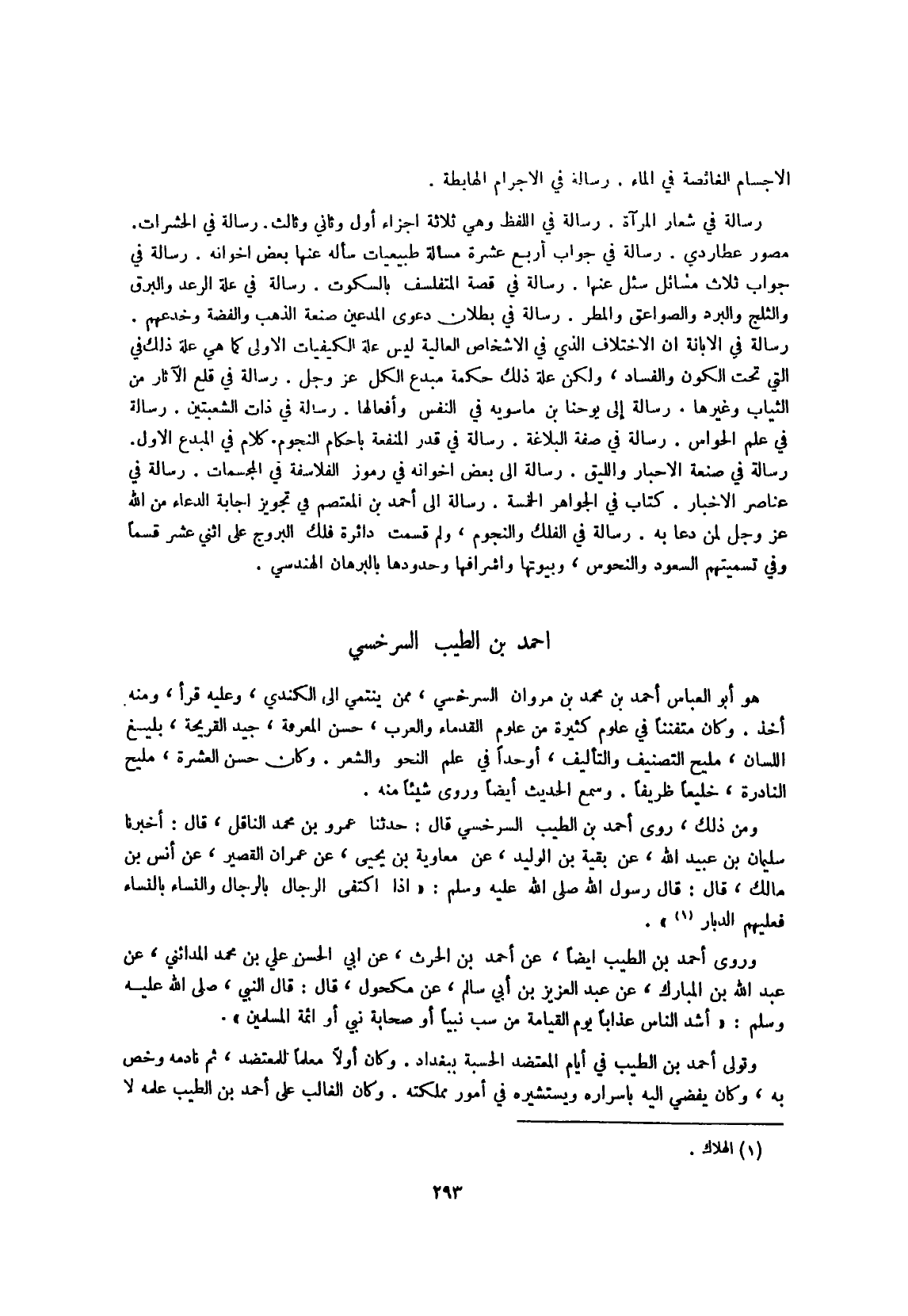 رِسَالَة فِي الْإِبَانَة أَن الِاخْتِلَاف الَّذِي فِي الْأَشْخَاص الْعَالِيَة لَيْسَ عِلّة الكيفيات الأولى كَمَا هِيَ عِلّة ذَلِك فِي الَّتِي تَحت الْكَوْن وَالْفساد وَلَكِن عِلّة ذَلِك حِكْمَة مبدع الْكل عز وَجل