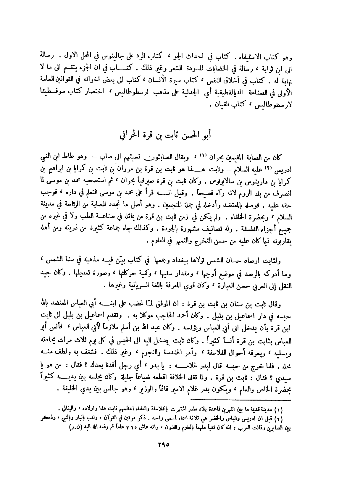 وَكَانَ ثَابت بن قُرَّة صيرفيا بحران ثمَّ استصحبه مُحَمَّد بن مُوسَى لما انْصَرف من بلد الرّوم لِأَنَّهُ رَآهُ فصيحا