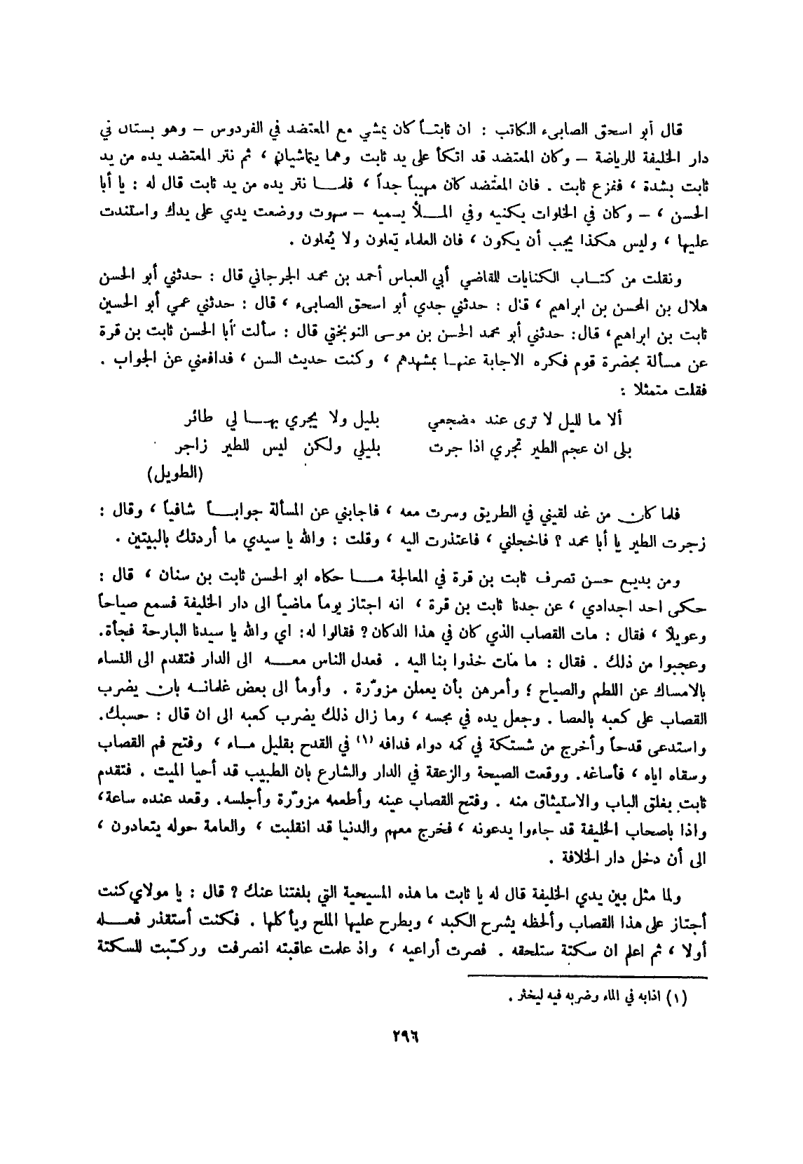 ونقلت من كتاب الْكِنَايَات للْقَاضِي أبي الْعَبَّاس أَحْمد بن مُحَمَّد الْجِرْجَانِيّ قَالَ حَدثنِي أَبُو الْحسن هِلَال بن المحسن بن إِبْرَاهِيم قَالَ حَدثنِي جدي أَبُو إِسْحَق الصَّابِئ قَالَ حَدثنِي عمي أَبُو الْحُسَيْن ثَابت بن إِبْرَاهِيم قَالَ حَدثنِي أَبُو مُحَمَّد الْحسن بن مُوسَى النوبختي قَالَ سَأَلت أَبَا الْحسن ثَابت بن قُرَّة عَن مَسْأَلَة بِحَضْرَة قوم فكره الْإِجَابَة عَنْهَا بمشهدهم وَكنت حَدِيث السن فدافعني عَن الْجَواب