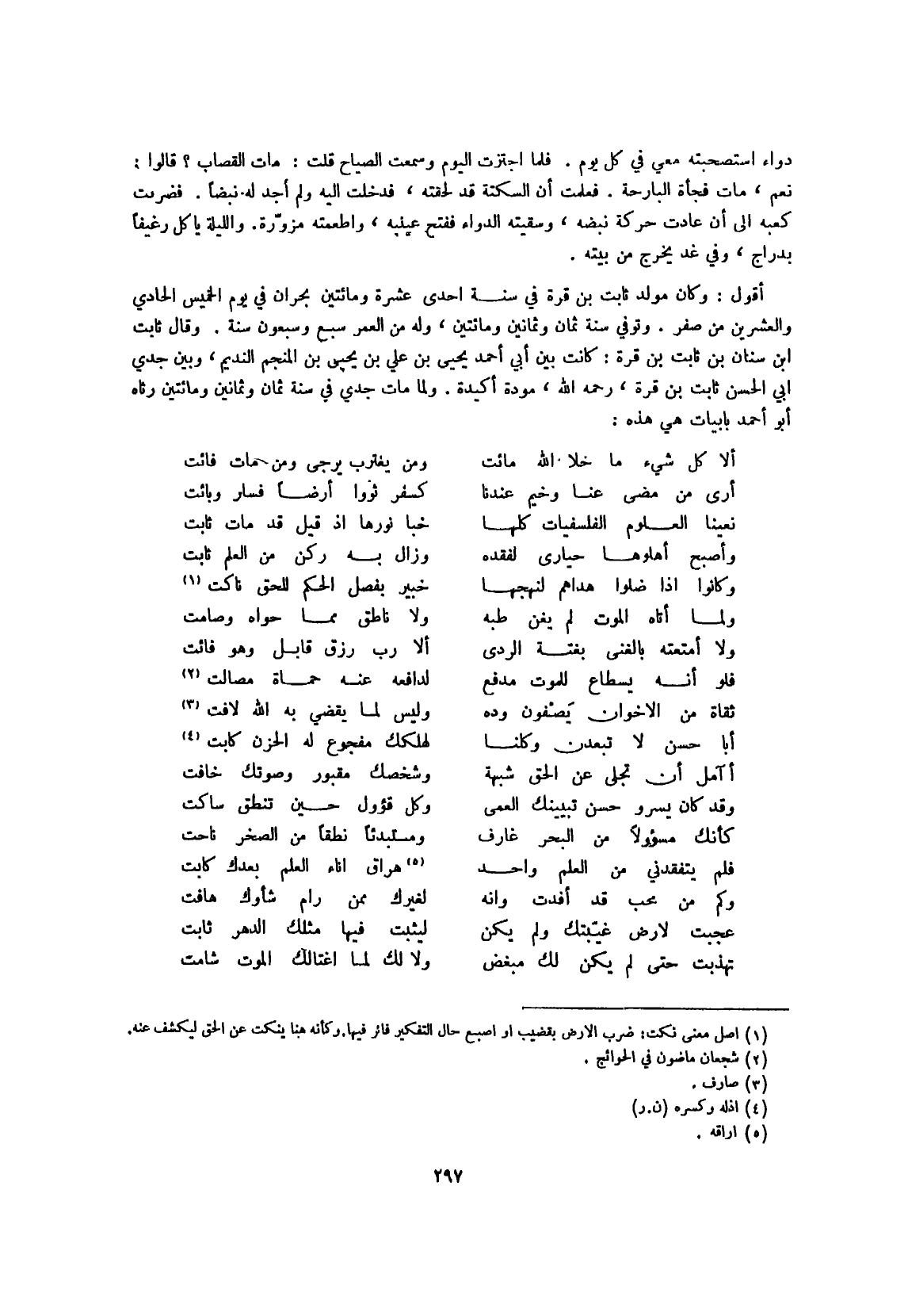 (نعينا الْعُلُوم الفلسفيات كلهَا ... خبا نورها إِذْ قيل قد مَاتَ ثَابت)