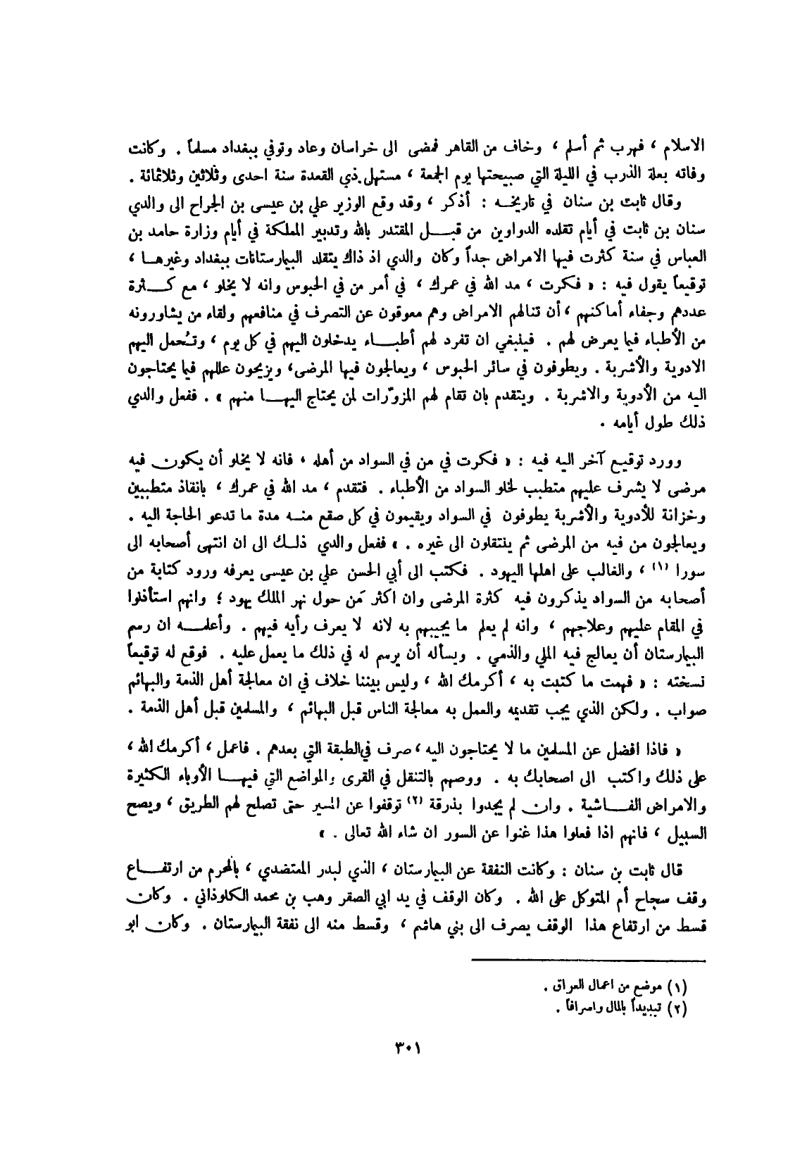 وَقَالَ ثَابت بن سِنَان فِي تَارِيخه أذكر وَقد وَقع الْوَزير عَليّ بن عِيسَى بن الْجراح إِلَى وَالِدي سِنَان بن ثَابت فِي أَيَّام تقلده الدَّوَاوِين من قبل المقتدر بِاللَّه وتدبير المملكة فِي أَيَّام وزارة حَامِد بن الْعَبَّاس فِي سنة كثرت فِيهَا الْأَمْرَاض جدا وَكَانَ وَالِدي إِذْ ذَاك يتقلد البيمارستانات بِبَغْدَاد وَغَيرهَا توقيعا يَقُول فِيهِ فَكرت مد الله فِي عمرك فِي أَمر من فِي الحبوس وَأَنه لَا يَخْلُو مَعَ كَثْرَة عَددهمْ وجفاء أماكنهم أَن تنالهم الْأَمْرَاض وهم معوقون عَن التَّصَرُّف فِي منافعهم ولقاء من يشاورونه من الْأَطِبَّاء فِيمَا يعرض لَهُم