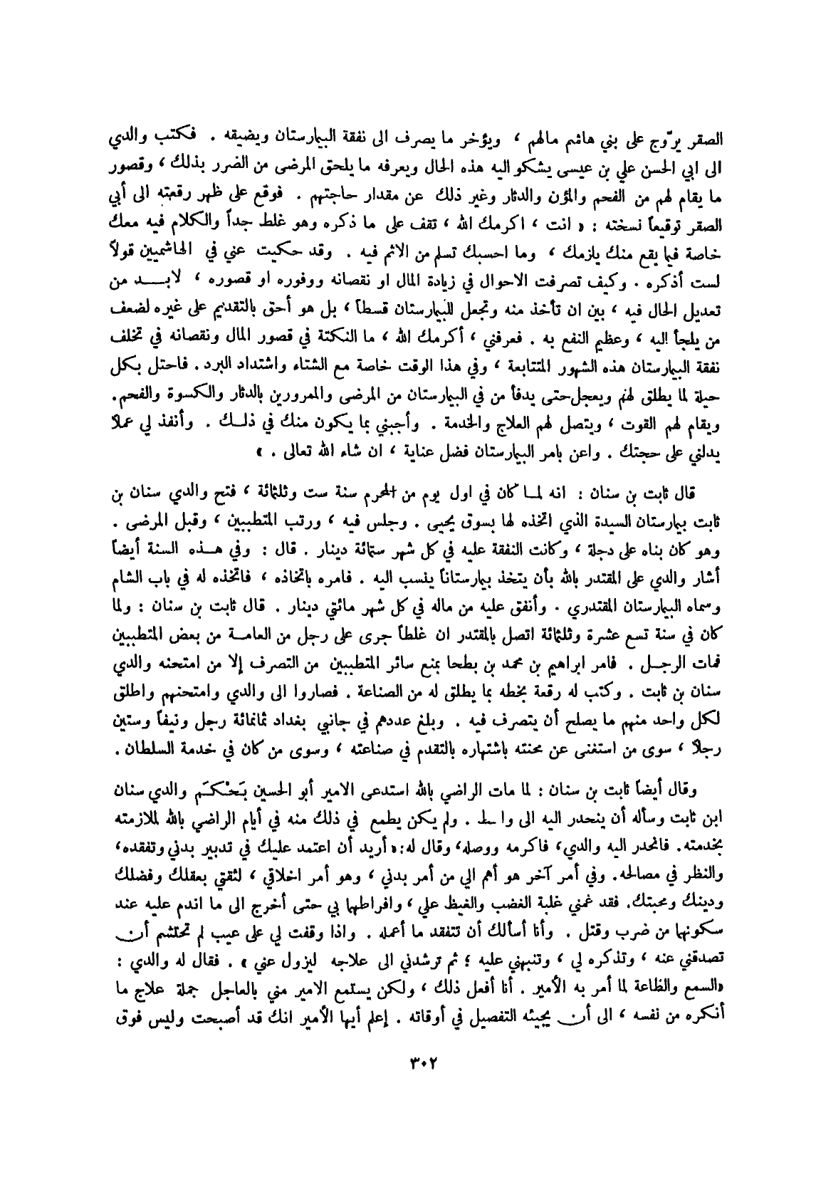 قَالَ وَفِي هَذِه السّنة أَيْضا أَشَارَ وَالِدي على المقتدر بِاللَّه بِأَن يتَّخذ بيمارستانا ينْسب إِلَيْهِ
