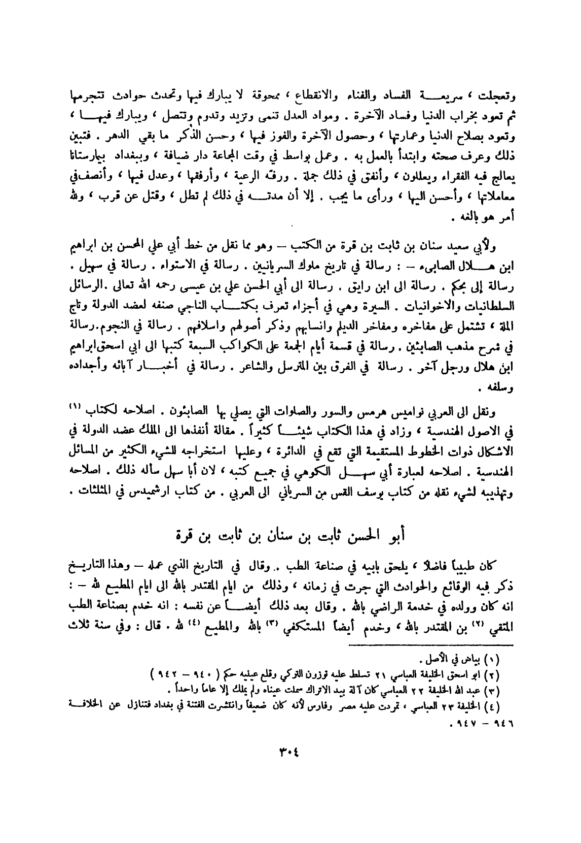 وَلأبي سعيد سِنَان بن ثَابت بن قُرَّة من الْكتب وَهُوَ مِمَّا نقل من خطّ أبي عَليّ المحسن بن إِبْرَاهِيم ابْن هِلَال الصَّابِئ رِسَالَة فِي تَارِيخ مُلُوك السريانيين
