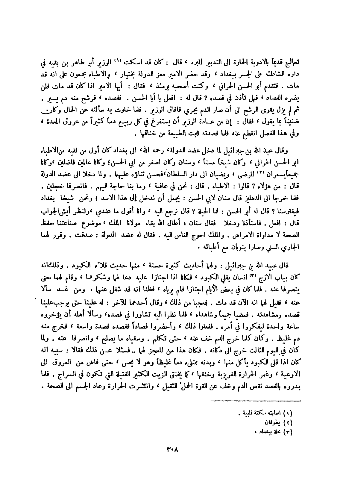 تعالج قَدِيما بالأدوية الحارة إِلَى التَّدْبِير الْمبرد قَالَ كَانَ قد أسكت الْوَزير أَبُو طَاهِر بن بقيه فِي دَاره الشاطئة على الجسر بِبَغْدَاد وَقد حضر الْأَمِير معز الدولة بختيار والأطباء مجمعون على أَنه قد مَاتَ