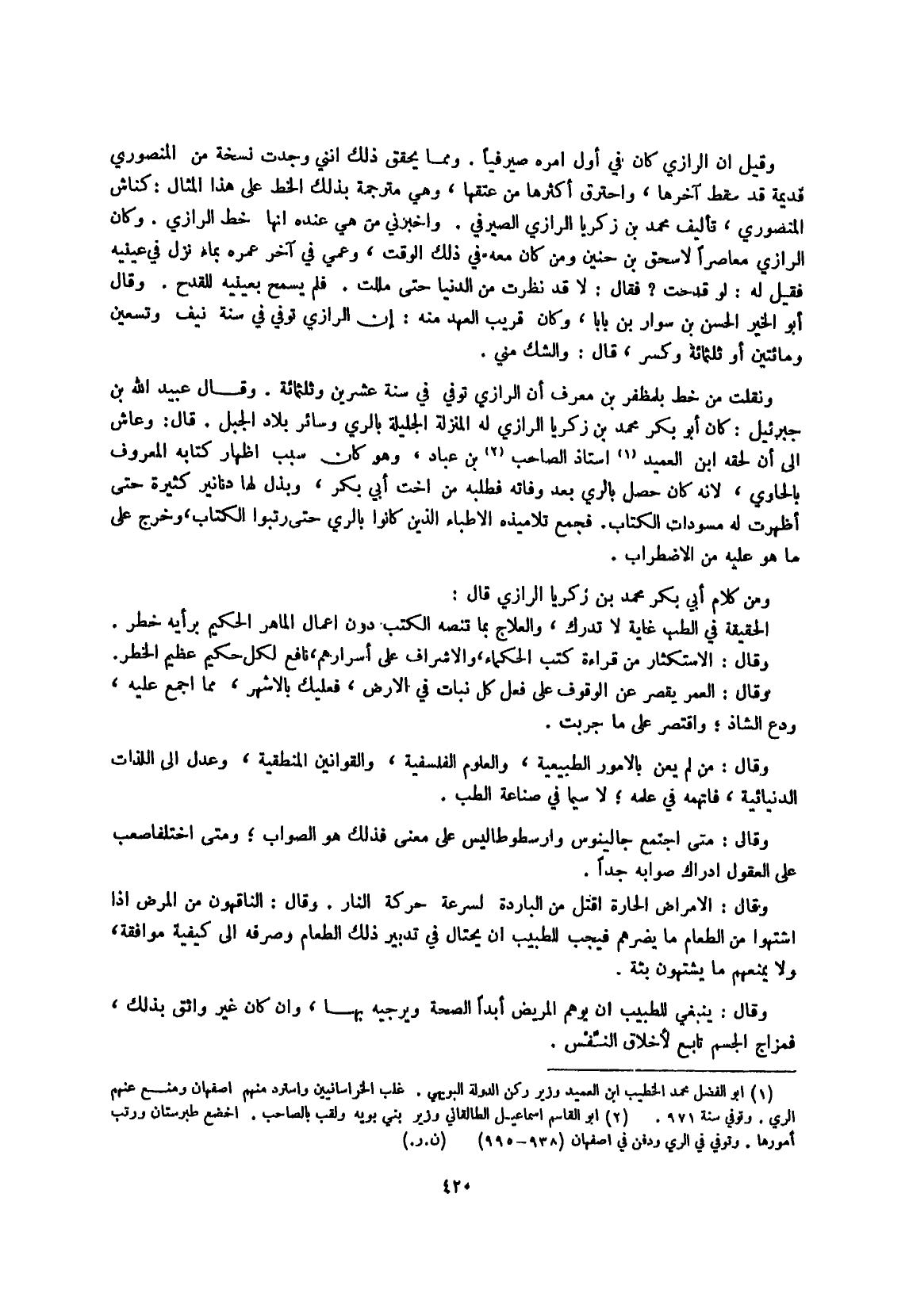 وَمِمَّا يُحَقّق ذَلِك أنني وجدت نُسْخَة من المنصوري قديمَة قد سقط آخرهَا وَاحْتَرَقَ أَكْثَرهَا من عتقهَا وَهِي مترجمة بذلك الْخط على هَذَا الْمِثَال كناش المنصوري تأليف مُحَمَّد بن زَكَرِيَّا الرَّازِيّ الصَّيْرَفِي