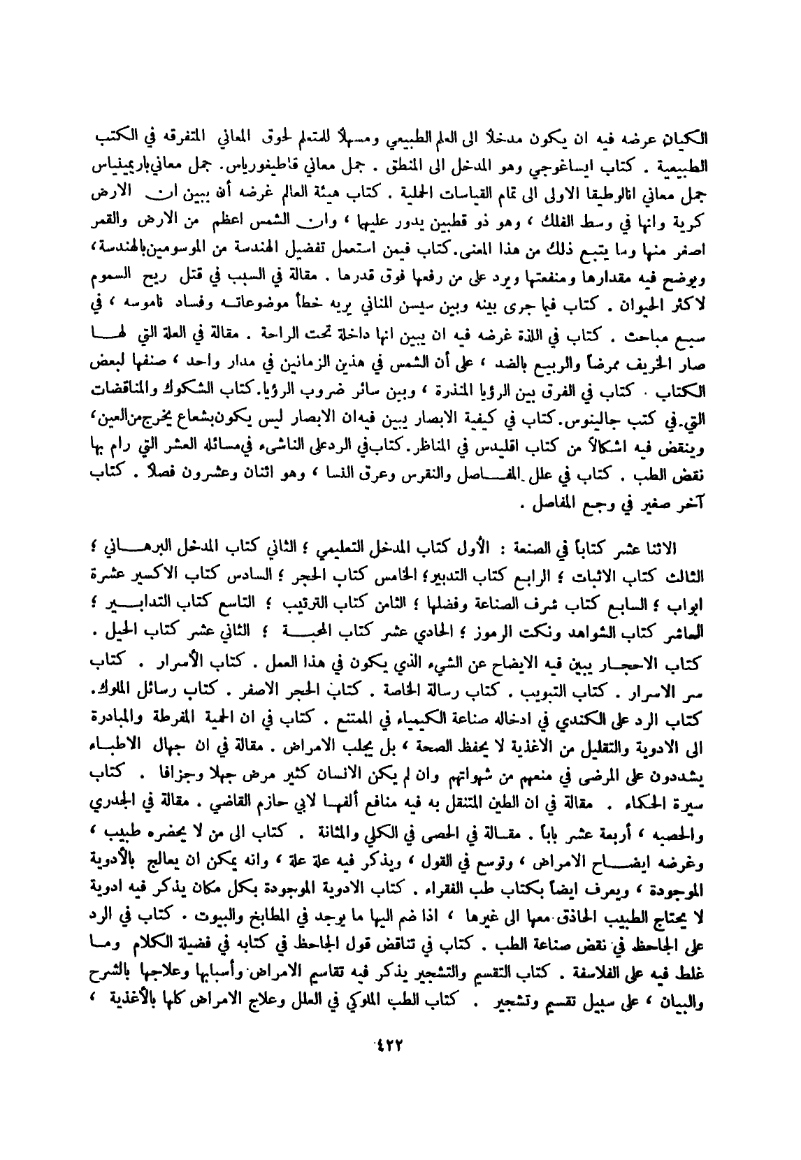 الكيان غَرَضه فِيهِ أَن يكون مدخلًا إِلَى الْعلم الطبيعي ومسهلا للمتعلم لُحُوق الْمعَانِي المتفرفة فِي الْكتب الطبيعية
