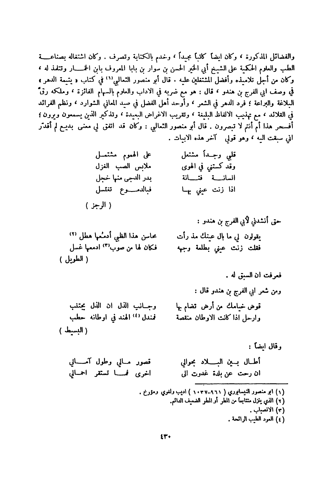 قَالَ أَبُو مَنْصُور الثعالبي فِي كتاب يتيمة الدَّهْر فِي وصف أبي الْفرج بن هندو قَالَ هُوَ مَعَ ضربه فِي الأداب والعلوم بِالسِّهَامِ الفائزة وَملكه رق البلاعة والبراعة فَرد الدَّهْر فِي الشّعْر وأوحد أهل الْفضل فِي صيد الْمعَانِي الشوارد ونظم الفرائد فِي القلائد مَعَ تَهْذِيب الْأَلْفَاظ البليغة وتقريب الْأَغْرَاض الْبَعِيدَة وتذكير الَّذين يسمعُونَ ويرون أفسحر هَذَا أم أَنْتُم لَا تبصرون