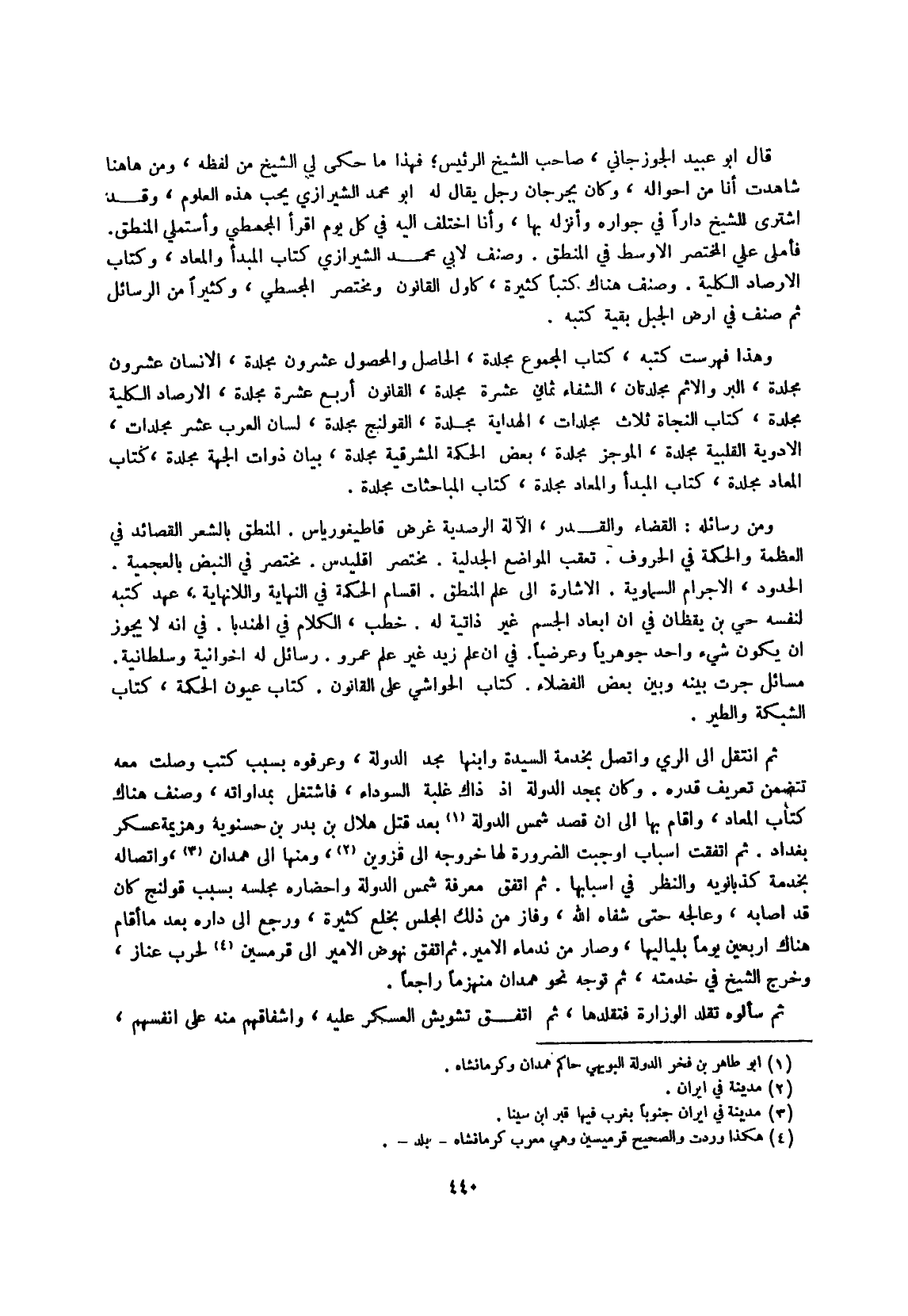 قَالَ أَبُو عبيد الْجوزجَاني صَاحب الشَّيْخ الرئيس فَهَذَا مَا حكى لي الشَّيْخ من لَفظه وَمن هَاهُنَا شاهدت أَنا من أَحْوَاله وَكَانَ بجرجان رجل يُقَال لَهُ أَبُو مُحَمَّد الشِّيرَازِيّ يحب هَذِه الْعُلُوم وَقد اشْترى للشَّيْخ دَارا فِي جواره وأنزله بهَا وَأَنا اخْتلف إِلَيْهِ فِي كل يَوْم اقْرَأ المجسطي وأستملي الْمنطق