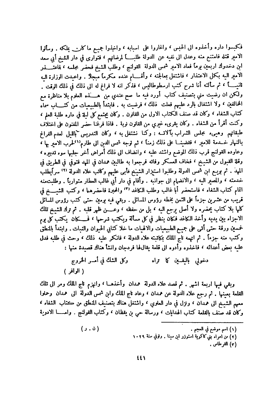 فَإِذا فَرغْنَا حضر المغنون على اخْتِلَاف طبقاتهم وهيئ مجْلِس الشَّرَاب بآلاته وَكُنَّا نشتغل بِهِ وَكَانَ التدريس بِاللَّيْلِ لعدم الْفَرَاغ بِالنَّهَارِ خدمَة للأمير فقضينا على ذَلِك زَمنا ثمَّ توجه شمس الدّين إِلَى طارم لِحَرْب الْأَمِير بهَا وعاوده القولنج قرب ذَلِك الْموضع وَاشْتَدَّ عَلَيْهِ وانضاف إِلَى ذَلِك أمراض أخر جلبها سوء تَدْبيره وَقلة الْقبُول من الشَّيْخ فخاف الْعَسْكَر وَفَاته فَرَجَعُوا بِهِ طَالِبين هَمدَان فِي المهد فَتوفي فِي الطَّرِيق فِي المهد