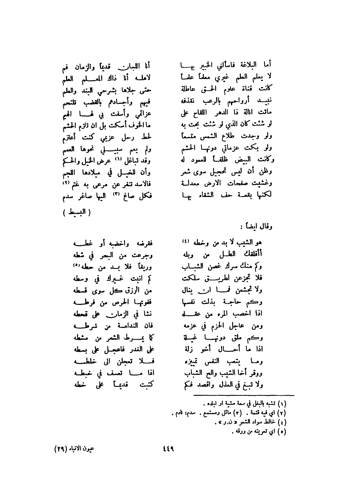 (أما البلاغة فاسألني الْخَبِير بهَا ... أَنا اللِّسَان قَدِيما وَالزَّمَان فَم)