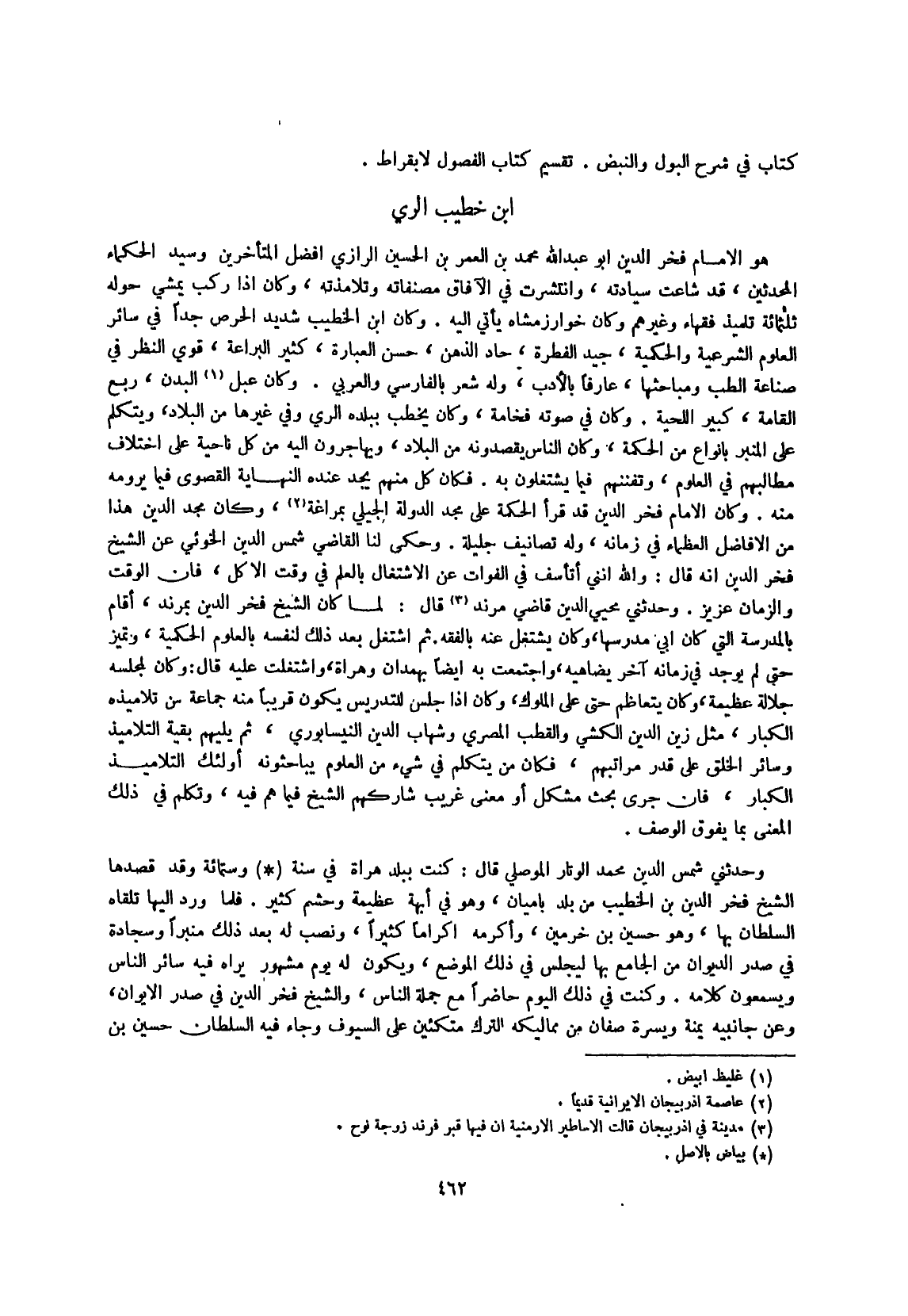 هُوَ الإِمَام فَخر الدّين أَبُو عبد الله مُحَمَّد بن الْعُمر بن الْحُسَيْن الرَّازِيّ أفضل الْمُتَأَخِّرين وَسيد الْحُكَمَاء الْمُحدثين قد شاعت سيادته وانتشرت فِي الْآفَاق مصنفاته وتلامذته وَكَانَ إِذا ركب يمشي حوله ثلثمِائة تلميذ فُقَهَاء وَغَيرهم وَكَانَ خوارزمشاه يَأْتِي إِلَيْهِ