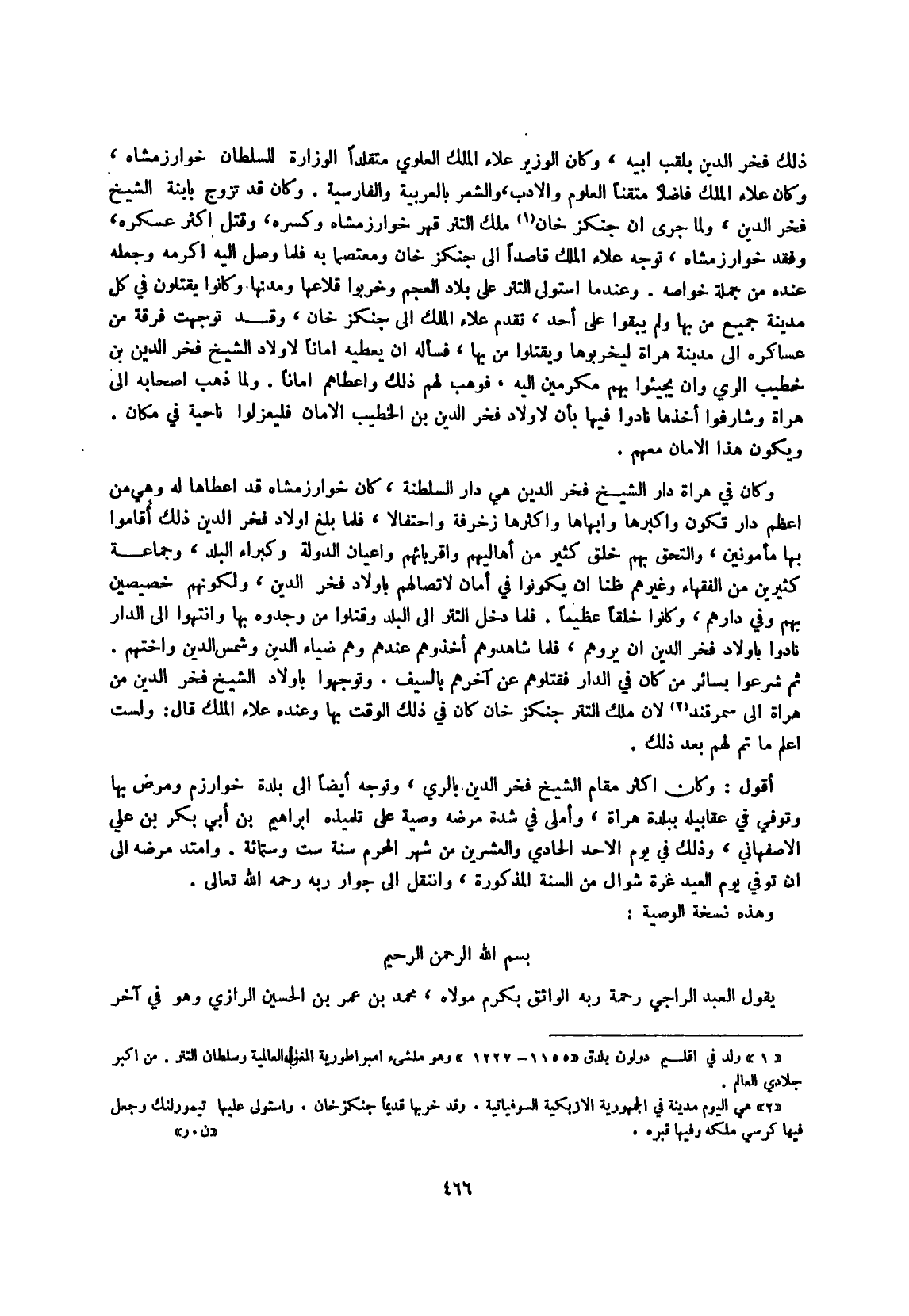 وتوجهوا بأولاد الشَّيْخ فَخر الدّين من هراة إِلَى سَمَرْقَنْد لِأَن ملك التتر جنكز خَان كَانَ فِي ذَلِك الْوَقْت بهَا وَعِنْده عَلَاء الْملك قَالَ وَلست اعْلَم مَا تمّ لَهُم بعد ذَلِك