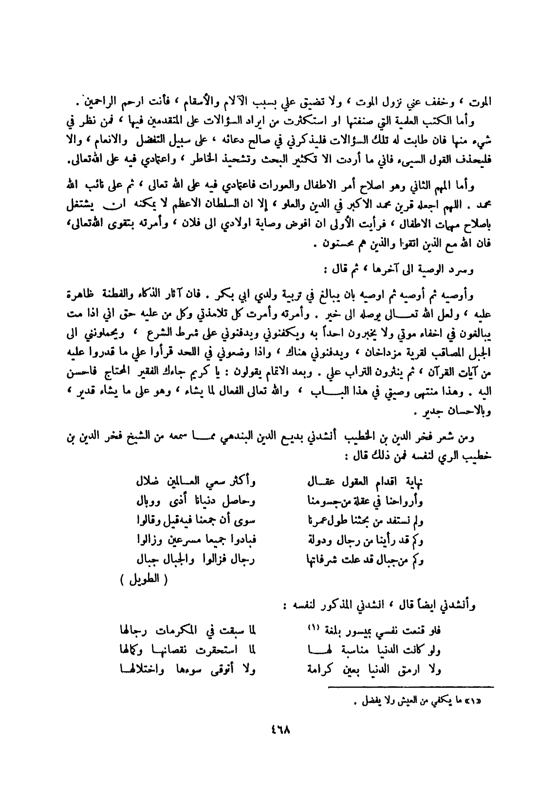 اللَّهُمَّ اجْعَلْهُ قرين مُحَمَّد الْأَكْبَر فِي الدّين والعلو إِلَّا أَن السُّلْطَان الْأَعْظَم لَا يُمكنهُ أَن يشْتَغل بإصلاح مهمات الْأَطْفَال فَرَأَيْت الأولى أَن أفوض وصاية أَوْلَادِي إِلَى فلَان وأمرته بتقوى الله تَعَالَى فَإِن الله مَعَ الَّذين اتَّقوا وَالَّذين هم محسنون