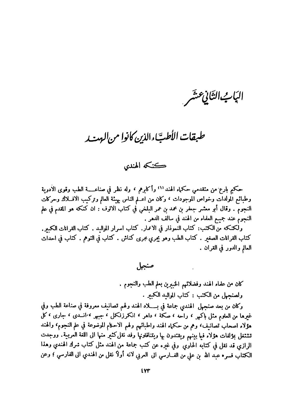 وَكَانَ من بعد صنجهل الْهِنْدِيّ جمَاعَة فِي بِلَاد الْهِنْد وَلَهُم تصانيف مَعْرُوفَة فِي صناعَة الطِّبّ وَفِي غَيرهَا من الْعُلُوم مثل باكهر راحه صَكَّة داهر أنكرزنكل جبهر اندى جارى كل هَؤُلَاءِ أَصْحَاب تصانيف وهم من حكماء الْهِنْد وأطبائهم وَلَهُم الْأَحْكَام الْمَوْضُوعَة فِي علم النُّجُوم والهند تشتغل بمؤلفات هَؤُلَاءِ فِيمَا بَينهم ويقتدون بهَا ويتناقلونها وَقد نقل كثير مِنْهَا إِلَى اللُّغَة الْعَرَبيَّة