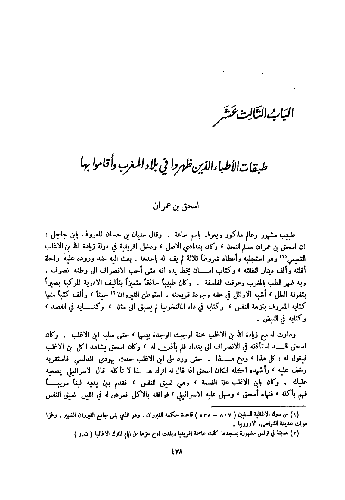 وَقَالَ سُلَيْمَان بن حسان الْمَعْرُوف بِابْن جلجل أَن إِسْحَق بن عمرَان مُسلم النحلة وَكَانَ بغدادي الأَصْل وَدخل أفريقية فِي دولة زِيَادَة الله بن الْأَغْلَب التَّمِيمِي وَهُوَ استجلبه وَأَعْطَاهُ شُرُوطًا ثَلَاثَة لم يَفِ لَهُ بأحدها