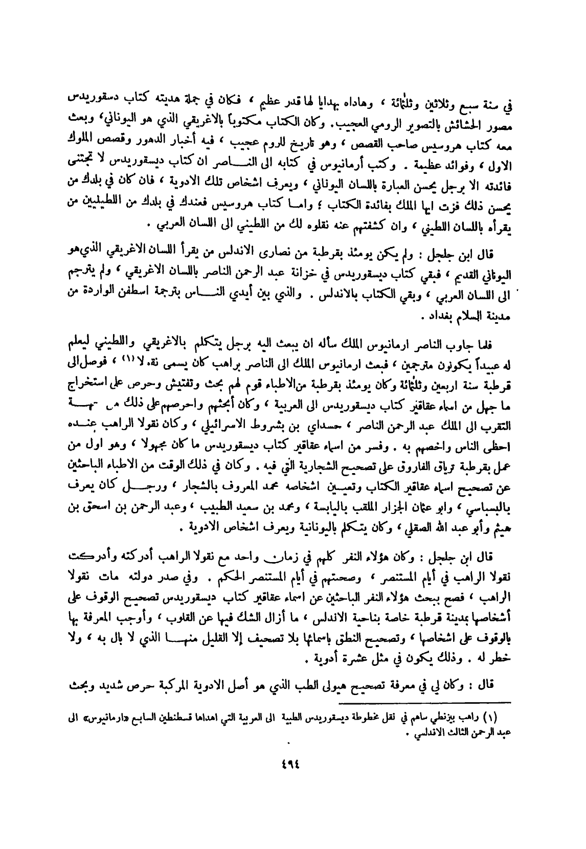 فَلَمَّا جاوب النَّاصِر أرمانيوس الْملك سَأَلَهُ أَن يبْعَث إِلَيْهِ بِرَجُل يتَكَلَّم بالإغريقي واللطيني ليعلم لَهُ عبيدا يكونُونَ مترجمين فَبعث أرمانيوس الْملك إِلَى النَّاصِر براهب كَانَ يُسمى نقولا فوصل إِلَى قرطبة سنة أَرْبَعِينَ وثلثمائة وَكَانَ يَوْمئِذٍ بقرطبة من الْأَطِبَّاء قوم لَهُم بحث وتفتيش وحرص على اسْتِخْرَاج مَا جهل من أَسمَاء عقاقير كتاب ديسقوريدس إِلَى الْعَرَبيَّة وَكَانَ أبحثهم وأحرصهم على ذَلِك من جِهَة التَّقَرُّب إِلَى الْملك عبد الرَّحْمَن النَّاصِر حسداي بن بِشُرُوط الإسرائيلي وَكَانَ نقولا الراهب عِنْده أحظى النَّاس وأخصهم بِهِ