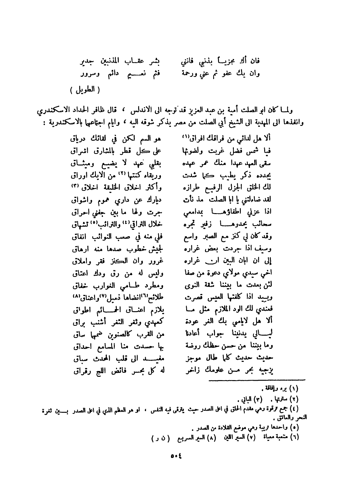 وَلما كَانَ أَبُو الصَّلْت أُميَّة بن عبد الْعَزِيز قد توجه إِلَى الأندلس قَالَ ظافر الْحداد الإسكندري وأنفذها إِلَى المهدية إِلَى الشَّيْخ أبي الصَّلْت من مصر يذكر شوقه إِلَيْهِ وَأَيَّام اجْتِمَاعهمَا بالإسكندرية