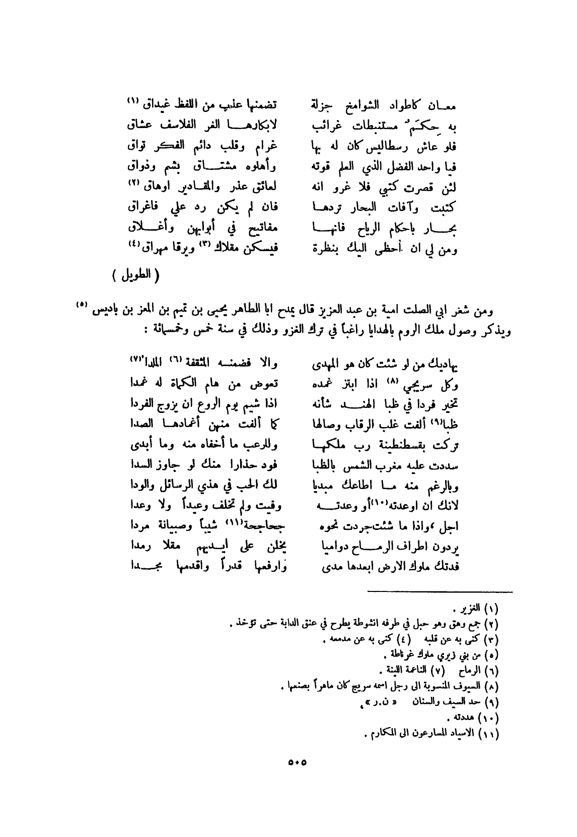 وَمن شعر أبي الصَّلْت أُميَّة بن عبد الْعَزِيز قَالَ يمدح أَبَا الطَّاهِر يحيى بن تَمِيم بن الْمعز بن باديس وَيذكر وُصُول ملك الرّوم بالهدايا رَاغِبًا فِي ترك الْغَزْو وَذَلِكَ فِي سنة خمس وَخَمْسمِائة