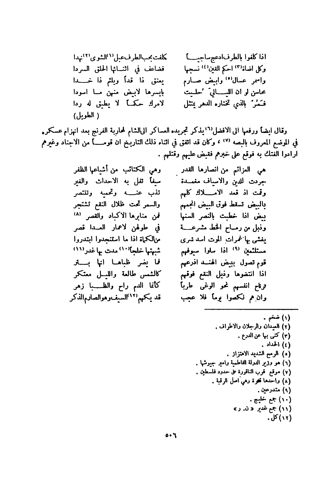 وَقَالَ أَيْضا ورفعها إِلَى الْأَفْضَل يذكر تجريده العساكر إِلَى الشَّام لمحاربة الفرنج بعد انهزام عسكره فِي الْموضع الْمَعْرُوف بالبصه وَكَانَ قد اتّفق فِي أثْنَاء ذَلِك التَّارِيخ أَن قوما من الأجناد وَغَيرهم أَرَادوا الفتك بِهِ فَوَقع على خبرهم فَقبض عَلَيْهِم وقتلهم