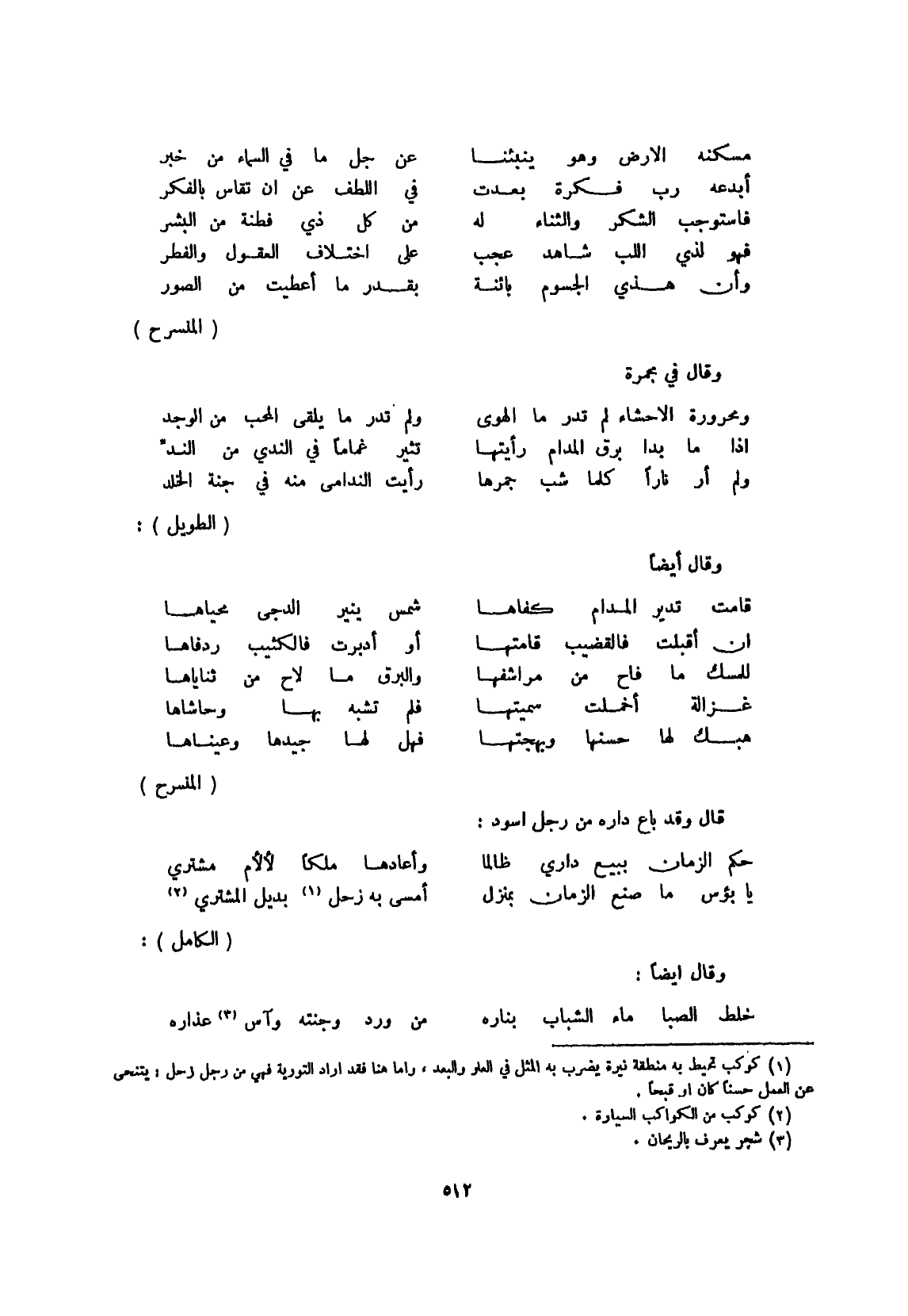 (يَا بؤس مَا صنع الزَّمَان بمنزل ... أَمْسَى بِهِ زحل بديل المُشْتَرِي) الْكَامِل