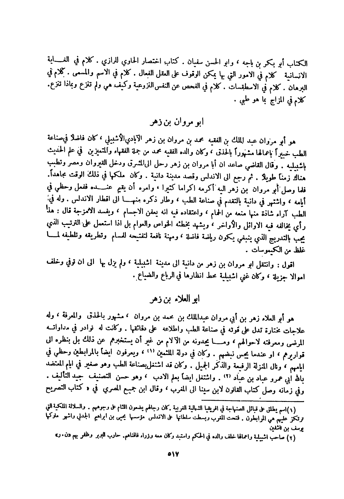 هُوَ أَبُو الْعَلَاء زهر بن أبي مَرْوَان عبد الْملك بن مُحَمَّد بن مَرْوَان مَشْهُور بالحذق والمعرفة وَله علاجات مختارة تدل على قوته فِي صناعَة الطِّبّ وإطلاعه على دقائقها