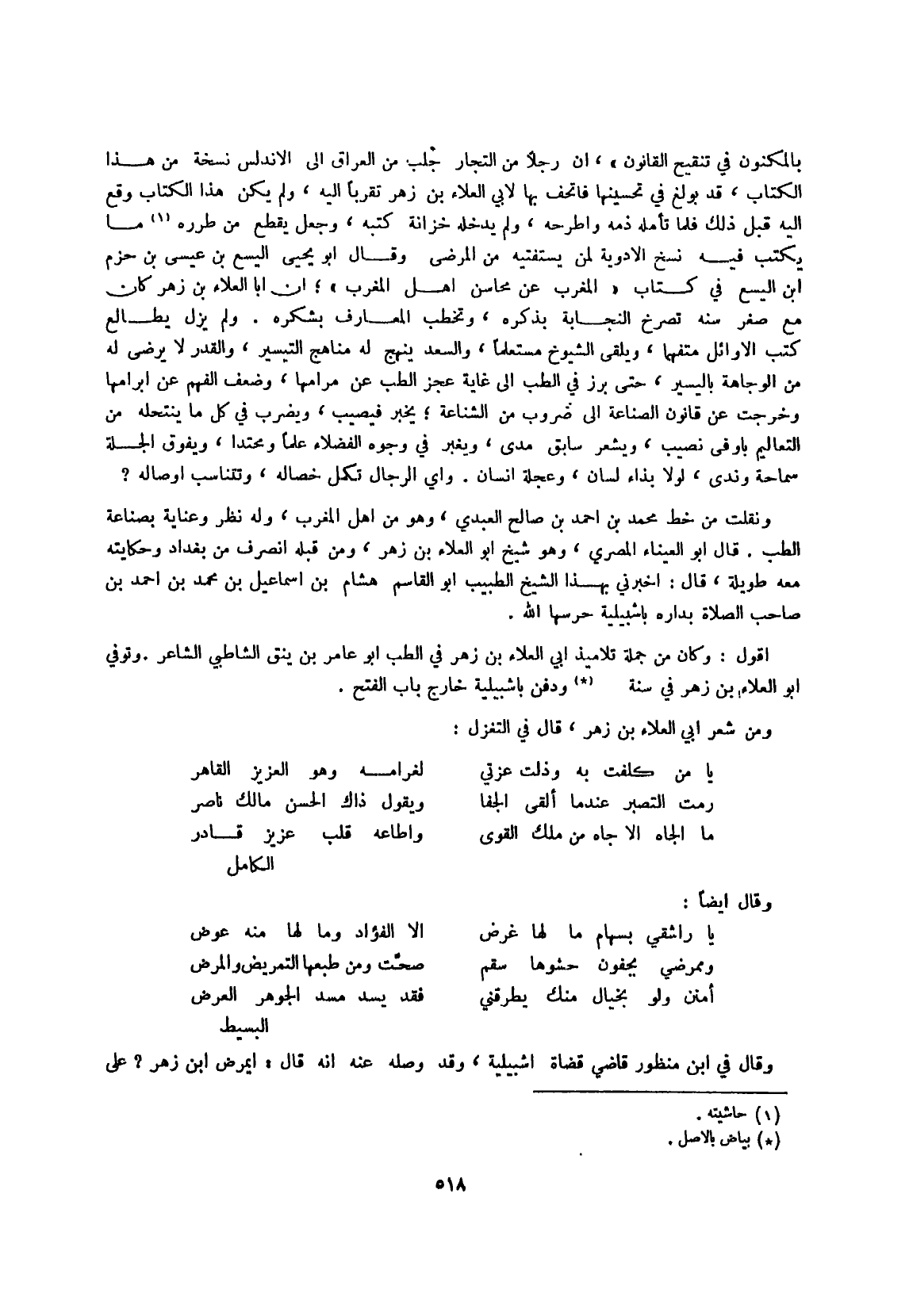 بالمكنون فِي تَنْقِيح القانون أَن رجلا من التُّجَّار جلب من الْعرَاق إِلَى الأندلس نُسْخَة من هَذَا الْكتاب قد بولغ فِي تحسينها فأتحف بهَا لأبي الْعَلَاء بن زهر تقربا إِلَيْهِ وَلم يكن هَذَا الْكتاب وَقع إِلَيْهِ قبل ذَلِك فَلَمَّا تَأمله ذمه وأطرحه وَلم يدْخلهُ خزانَة كتبه وَجعل يقطع من طرره مَا يكْتب فِيهِ نسخ الْأَدْوِيَة لمن يستفتيه من المرضى وَقَالَ أَبُو يحيى اليسع بن عِيسَى بن حزم ابْن اليسع فِي كتاب الْمغرب عَن محَاسِن أهل الْمغرب أَن أَبَا الْعَلَاء بن زهر كَانَ مَعَ صغر سنه تصرخ النجابة بِذكرِهِ وتخطب المعارف بشكره