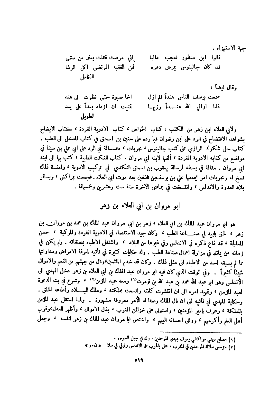 هُوَ أَبُو مَرْوَان عبد الْملك بن أبي الْعَلَاء زهر بن أبي مَرْوَان عبد الْملك بن مُحَمَّد بن مَرْوَان بن زهر لحق بِأَبِيهِ فِي صناعَة الطِّبّ وَكَانَ جيد الِاسْتِقْصَاء فِي الْأَدْوِيَة المفردة والمركبة حسن المعالجة قد ذاع ذكره فِي الأندلس وَفِي غَيرهَا من الْبِلَاد واشتغل الْأَطِبَّاء بمصنفاته