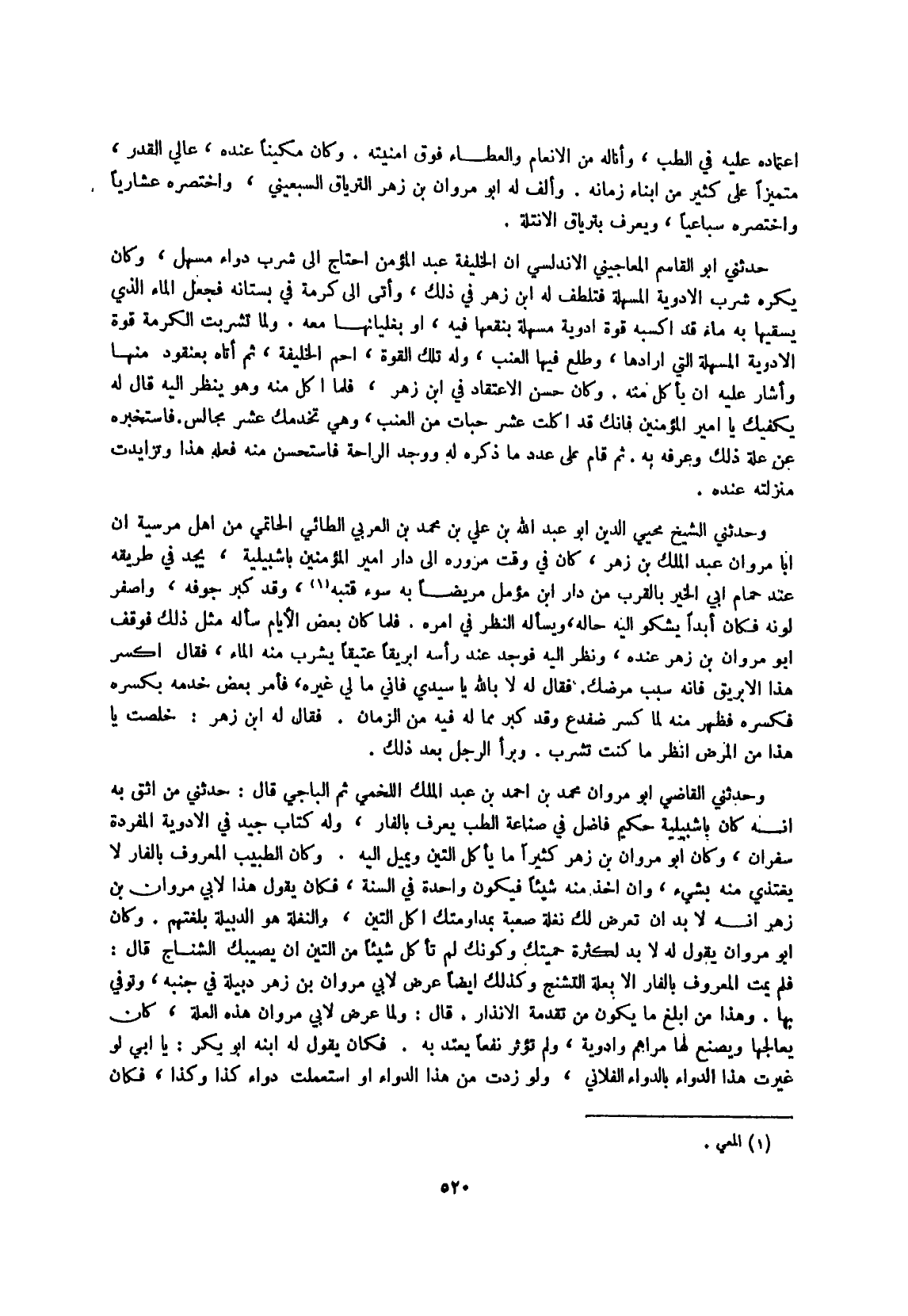 حَدثنِي أَبُو الْقَاسِم المعاجيني الأندلسي أَن الْخَلِيفَة عبد الْمُؤمن احْتَاجَ إِلَى شرب دَوَاء مسهل وَكَانَ يكره شرب الْأَدْوِيَة المسهلة فتلطف لَهُ ابْن زهر فِي ذَلِك وأتى إِلَى كرمة فِي بستانه فَجعل المَاء الَّذِي يسقيها بِهِ مَاء قد أكسبه قُوَّة أدوية مسهلة بنقعها فِيهِ أَو بغليانها مَعَه
