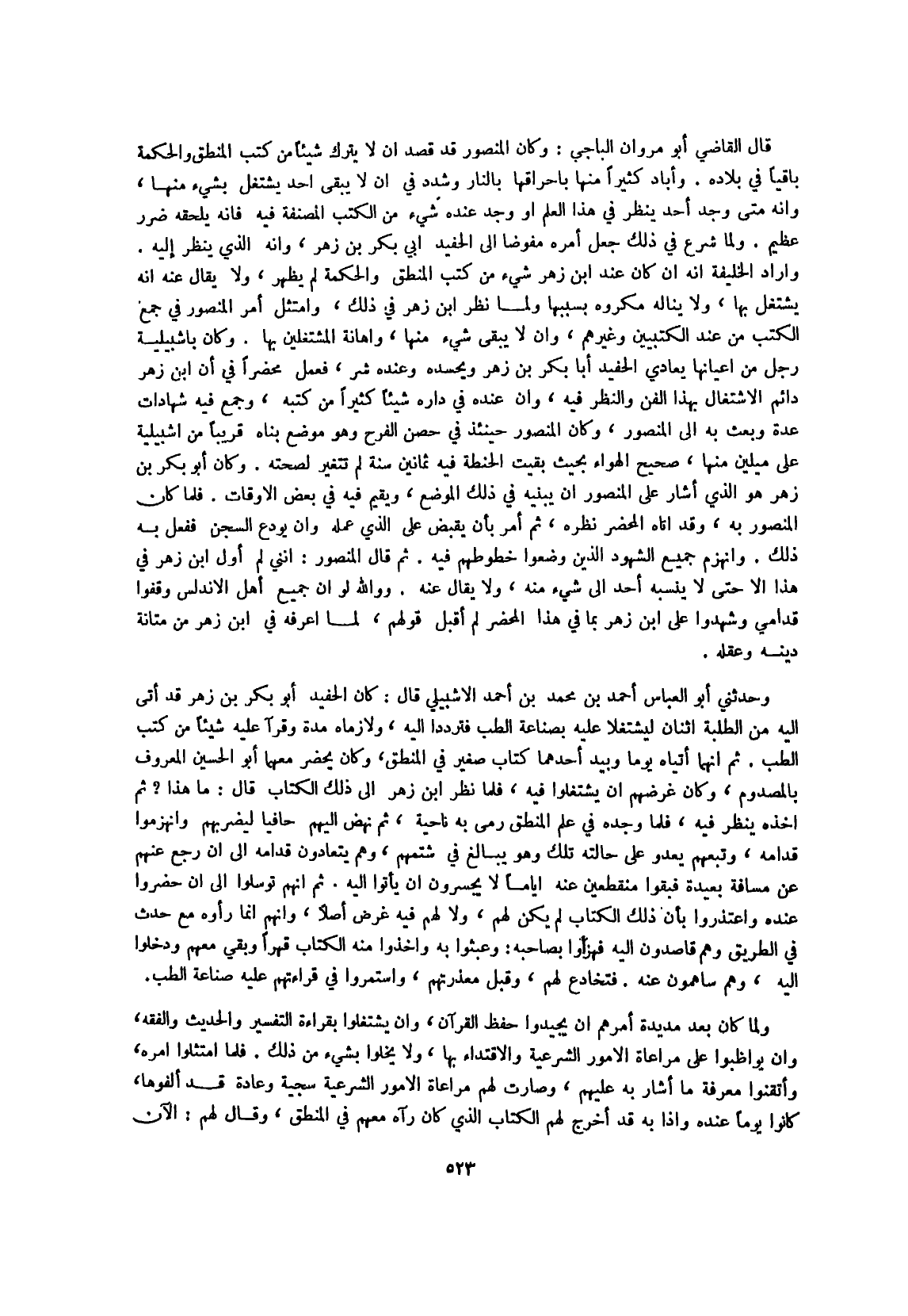 قَالَ القَاضِي أَبُو مَرْوَان الْبَاجِيّ وَكَانَ الْمَنْصُور قد قصد أَن لَا يتْرك شَيْئا من كتب الْمنطق وَالْحكمَة بَاقِيا فِي بِلَاده