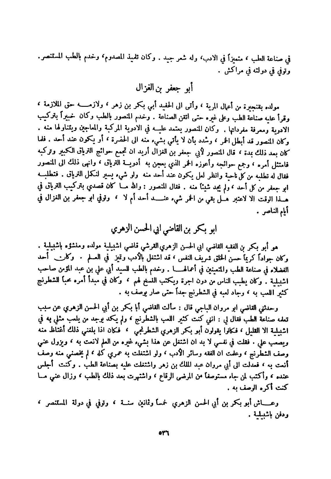 فَقَالَ الْمَنْصُور وَالله مَا كَانَ قصدي بتركيب الترياق فِي هَذَا الْوَقْت إِلَّا لاعتبر هَل بَقِي من الْخمر شَيْء عِنْد أحد أم لَا وَتُوفِّي أَبُو جَعْفَر بن الغزال فِي أَيَّام النَّاصِر