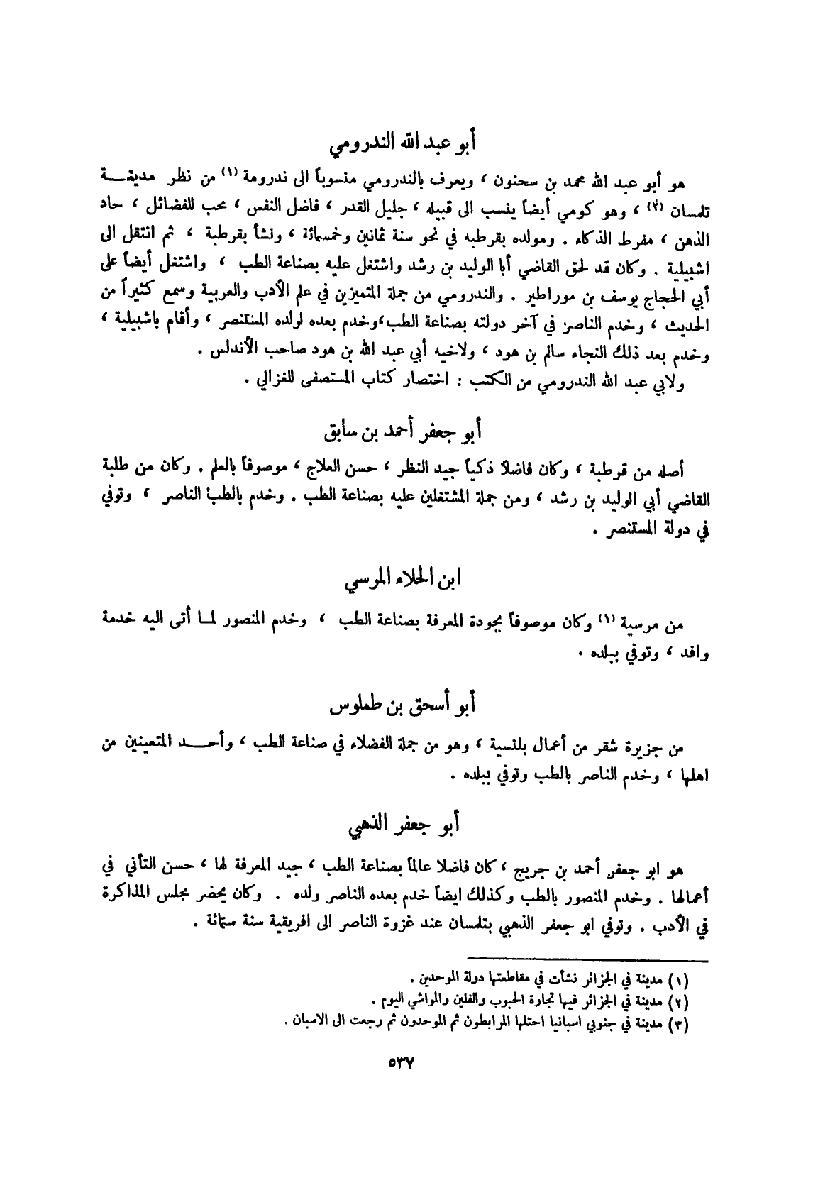 والندرومي من جملَة المتميزين فِي علم الْأَدَب والعربية وَسمع كثيرا من الحَدِيث وخدم النَّاصِر فِي آخر دولته بصناعة الطِّبّ وخدم بعده لوَلَده الْمُسْتَنْصر وَأقَام بأشبيلية وخدم بعد ذَلِك النَّجَاء سَالم بن هود ولأخيه أبي عبد الله بن هود صَاحب الأندلس
