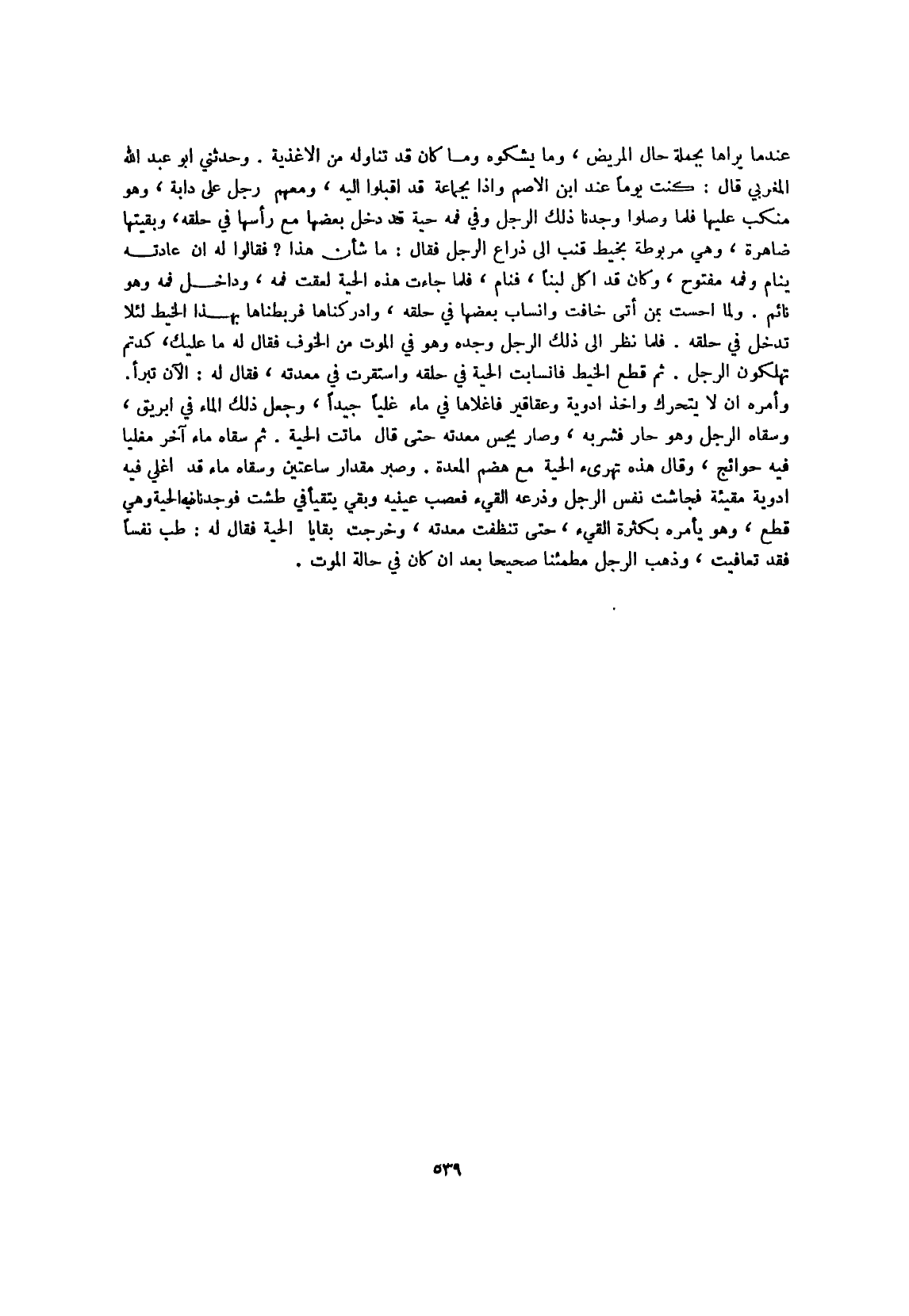وصبر مِقْدَار ساعتين وسقاه مَاء قد أغلي فِيهِ أدوية مقيئة فَجَاشَتْ نفس الرجل وذرعه الْقَيْء فعصب عَيْنَيْهِ وَبَقِي يتقيأ فِي طشت فَوَجَدنَا فِيهِ الْحَيَّة وَهِي قطع وَهُوَ يَأْمُرهُ بِكَثْرَة الْقَيْء حَتَّى تنظفت معدته وَخرجت بقايا الْحَيَّة فَقَالَ لَهُ طب نفسا فقد تعافيت وَذهب الرجل مطمئنا صَحِيحا بعد أَن كَانَ فِي حَالَة الْمَوْت