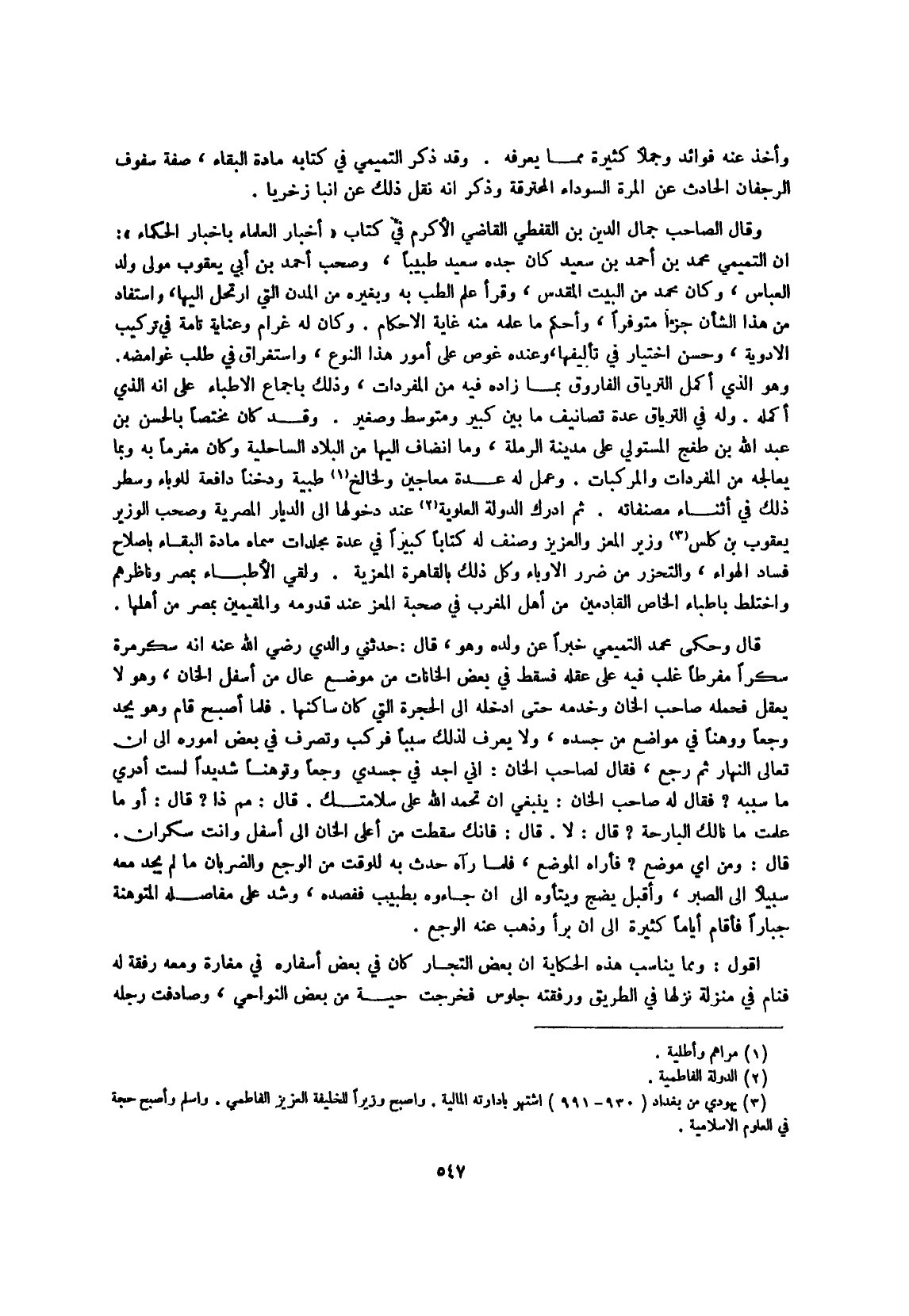 وَقَالَ الصاحب جمال الدّين بن القفطي القَاضِي الأكرم فِي كتاب أَخْبَار الْعلمَاء بأخبار الْحُكَمَاء أَن التَّمِيمِي مُحَمَّد بن أَحْمد بن سعيد كَانَ جده سعيد طَبِيبا وَصَحب أَحْمد بن أبي يَعْقُوب مولى ولد الْعَبَّاس وَكَانَ مُحَمَّد من الْبَيْت الْمُقَدّس وَقَرَأَ علم الطِّبّ بِهِ وَبِغَيْرِهِ من المدن الَّتِي ارتحل إِلَيْهَا واستفاد من هَذَا الشَّأْن جُزْءا متوفرا وَأحكم مَا علمه مِنْهُ غَايَة الْأَحْكَام