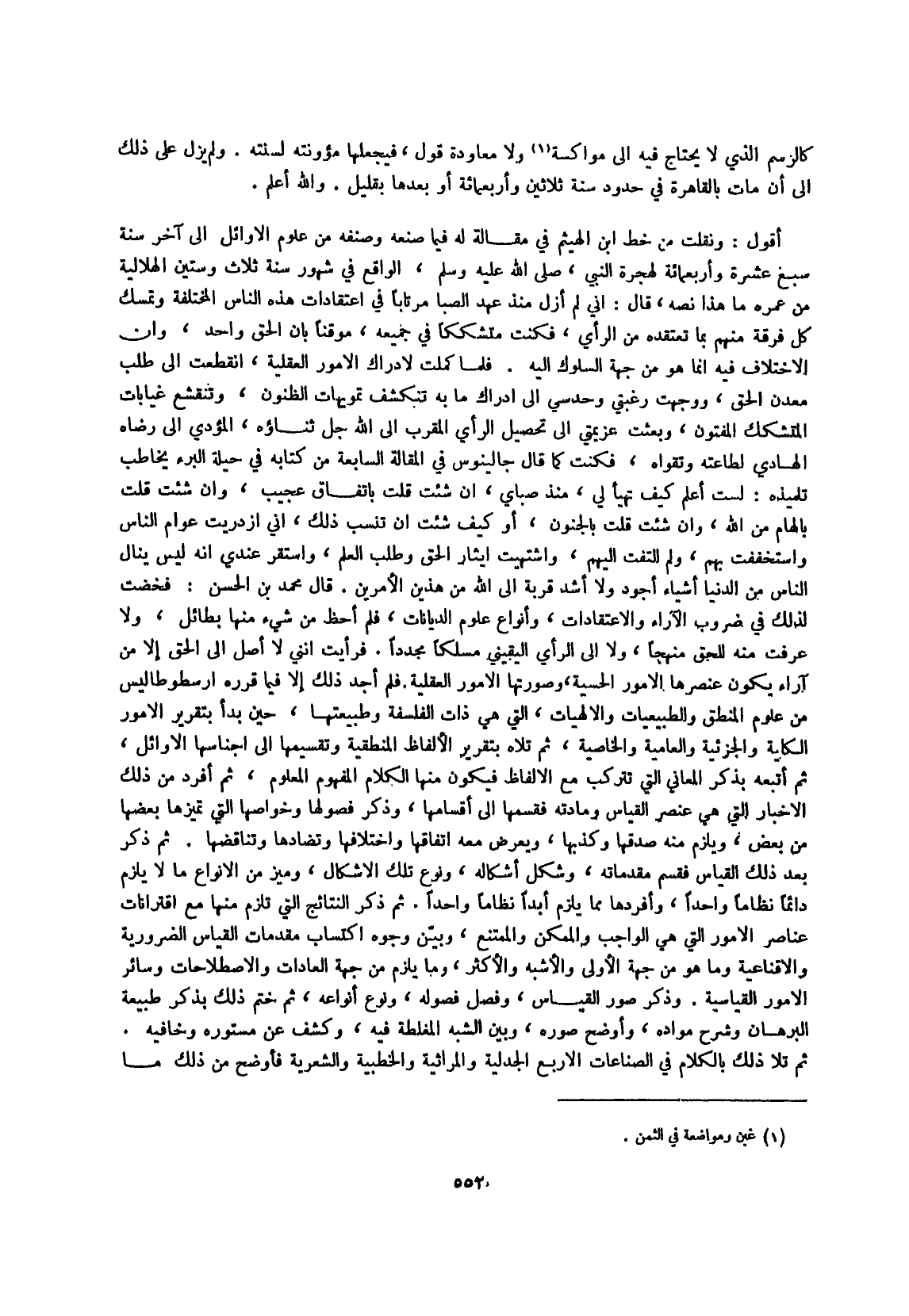 أَقُول ونقلت من خطّ ابْن الْهَيْثَم فِي مقَالَة لَهُ فِيمَا صنعه وصنفه من عُلُوم الْأَوَائِل إِلَى آخر سنة سبع عشرَة وَأَرْبَعمِائَة لهجرة النَّبِي صلى الله عَلَيْهِ وَسلم الْوَاقِع فِي شهور سنة ثَلَاث وَسِتِّينَ الْهِلَالِيَّة من عمره مَا هَذَا نَصه قَالَ إِنِّي لم أزل مُنْذُ عهد الصِّبَا مُرْتَابا فِي اعتقادات هَذِه النَّاس الْمُخْتَلفَة وَتمسك كل فرقة مِنْهُم بِمَا تعتقده من الرَّأْي فَكنت متشككا فِي جَمِيعه موقنا بِأَن الْحق وَاحِد وَأَن الِاخْتِلَاف فِيهِ إِنَّمَا هُوَ من جِهَة السلوك إِلَيْهِ