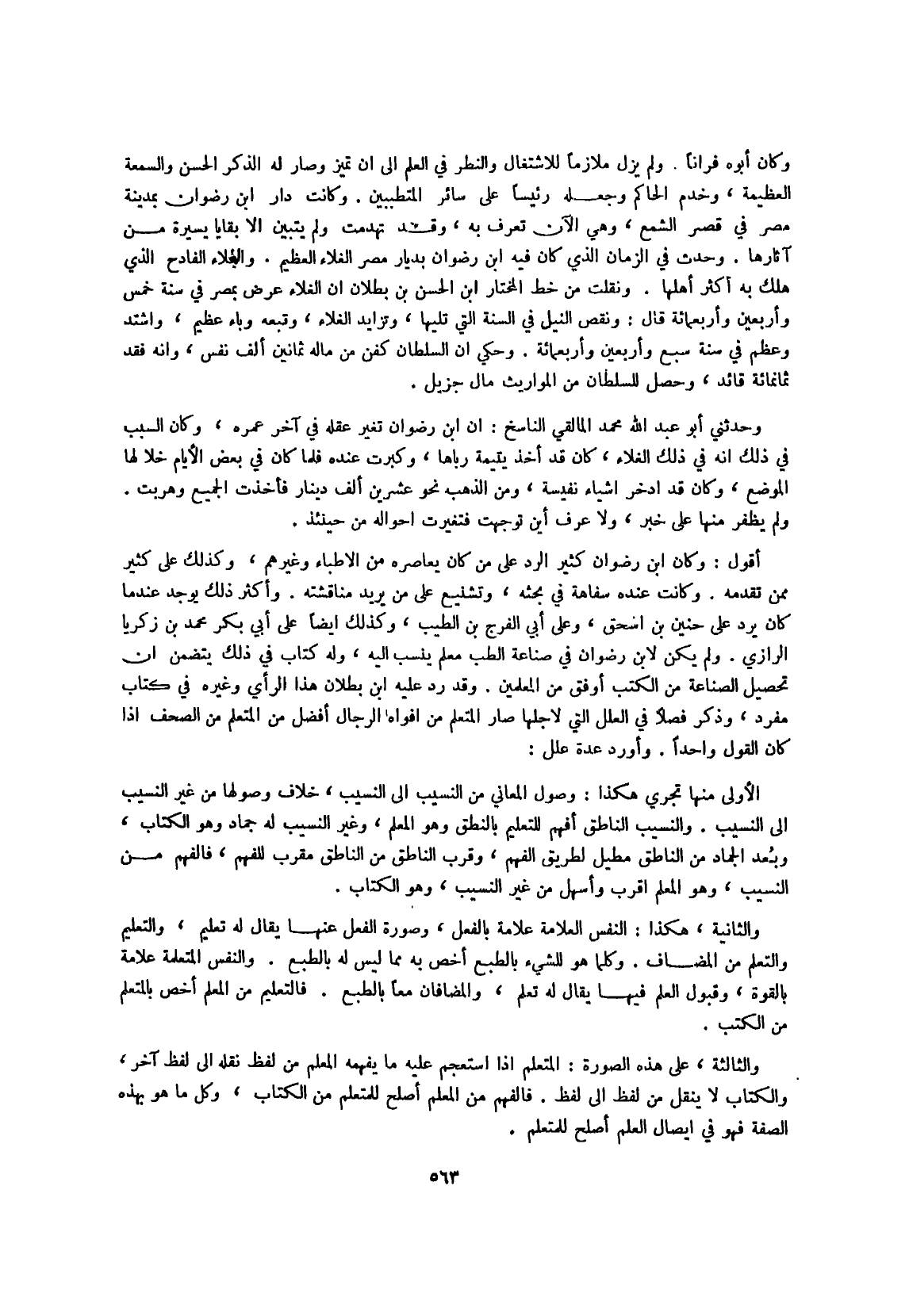وَلم يكن لِابْنِ رضوَان فِي صناعَة الطِّبّ معلم ينْسب إِلَيْهِ وَله كتاب فِي ذَلِك يتَضَمَّن أَن تَحْصِيل الصِّنَاعَة من الْكتب أوفق من المعلمين