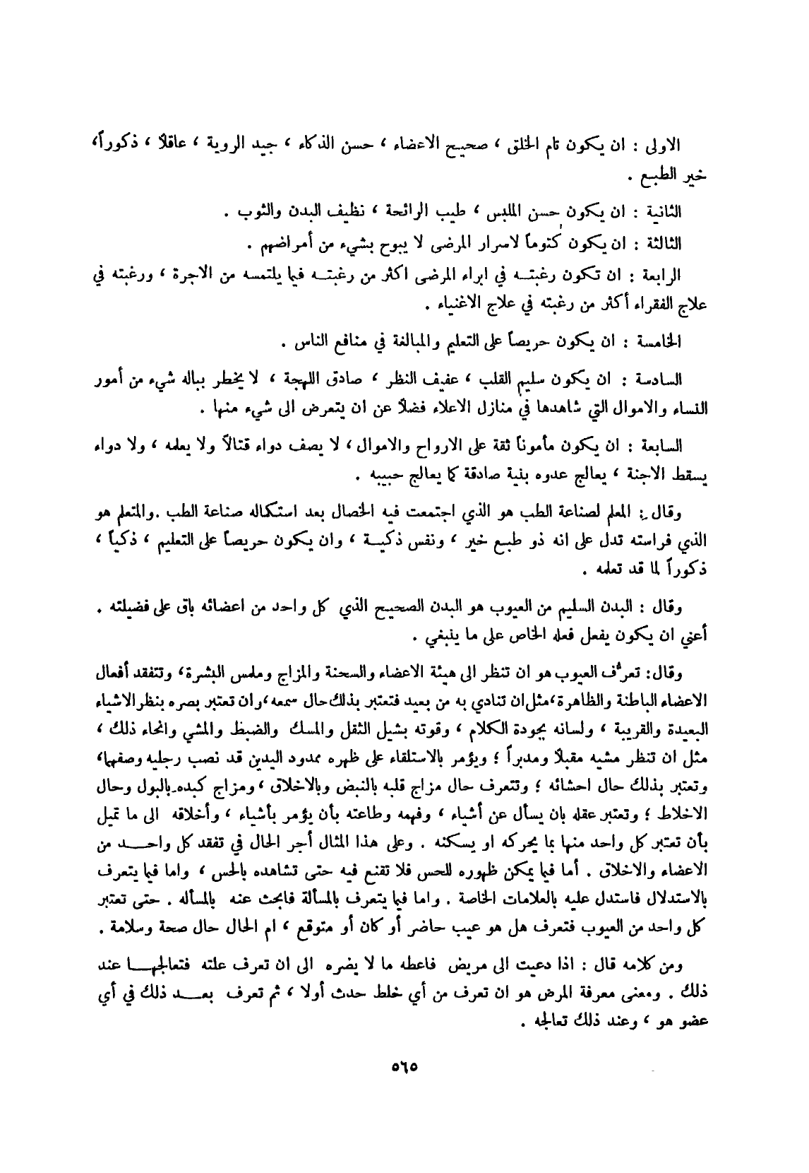 وَقَالَ الْمعلم لصناعة الطِّبّ هُوَ الَّذِي اجْتمعت فِيهِ الْخِصَال بعد استكماله صناعَة الطِّبّ