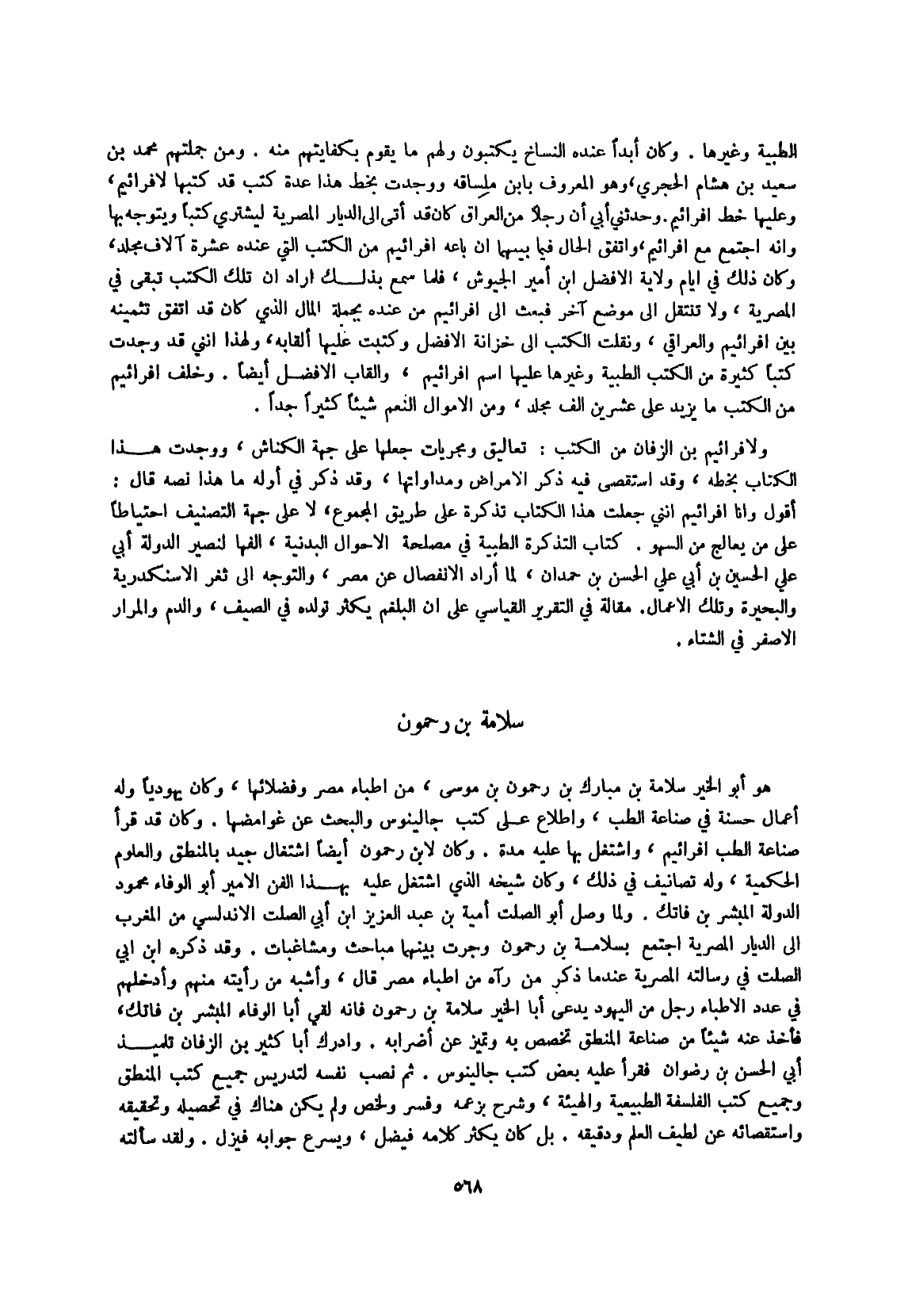 وحَدثني أبي أَن رجلا من الْعرَاق كَانَ قد أَتَى إِلَى الديار المصرية ليَشْتَرِي كتبا وَيتَوَجَّهُ بهَا وَأَنه اجْتمع مَعَ افرائيم وَاتفقَ الْحَال فِيمَا بَينهمَا أَن بَاعه افرائيم من الْكتب الَّتِي عِنْده عشرَة آلَاف مُجَلد وَكَانَ ذَلِك فِي أَيَّام ولَايَة الْأَفْضَل ابْن أَمِير الجيوش فَلَمَّا سمع بذلك أَرَادَ أَن تِلْكَ الْكتب تبقى فِي المصرية وَلَا تنْتَقل إِلَى مَوضِع آخر فَبعث إِلَى افرائيم من عِنْده بجملة المَال الَّذِي كَانَ قد اتّفق تثمينه بَين افرائيم والعراقي ونقلت الْكتب إِلَى خزانَة الْأَفْضَل وكتبت عَلَيْهَا ألقابه وَلِهَذَا أنني قد وجدت كتبا كَثِيرَة من الْكتب الطبية وَغَيرهَا عَلَيْهَا اسْم افرائيم وألقاب الْأَفْضَل أَيْضا