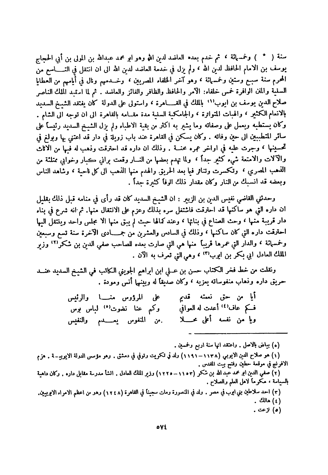 ونقلت من خطّ فَخر الْكتاب حسن بن عَليّ ابْن إِبْرَاهِيم الْجُوَيْنِيّ الْكَاتِب فِي الشَّيْخ السديد عِنْد حريق دَاره وَذَهَاب منفوساته يعزيه وَكَانَ صديقا لَهُ وَبَينهمَا أنس ومودة