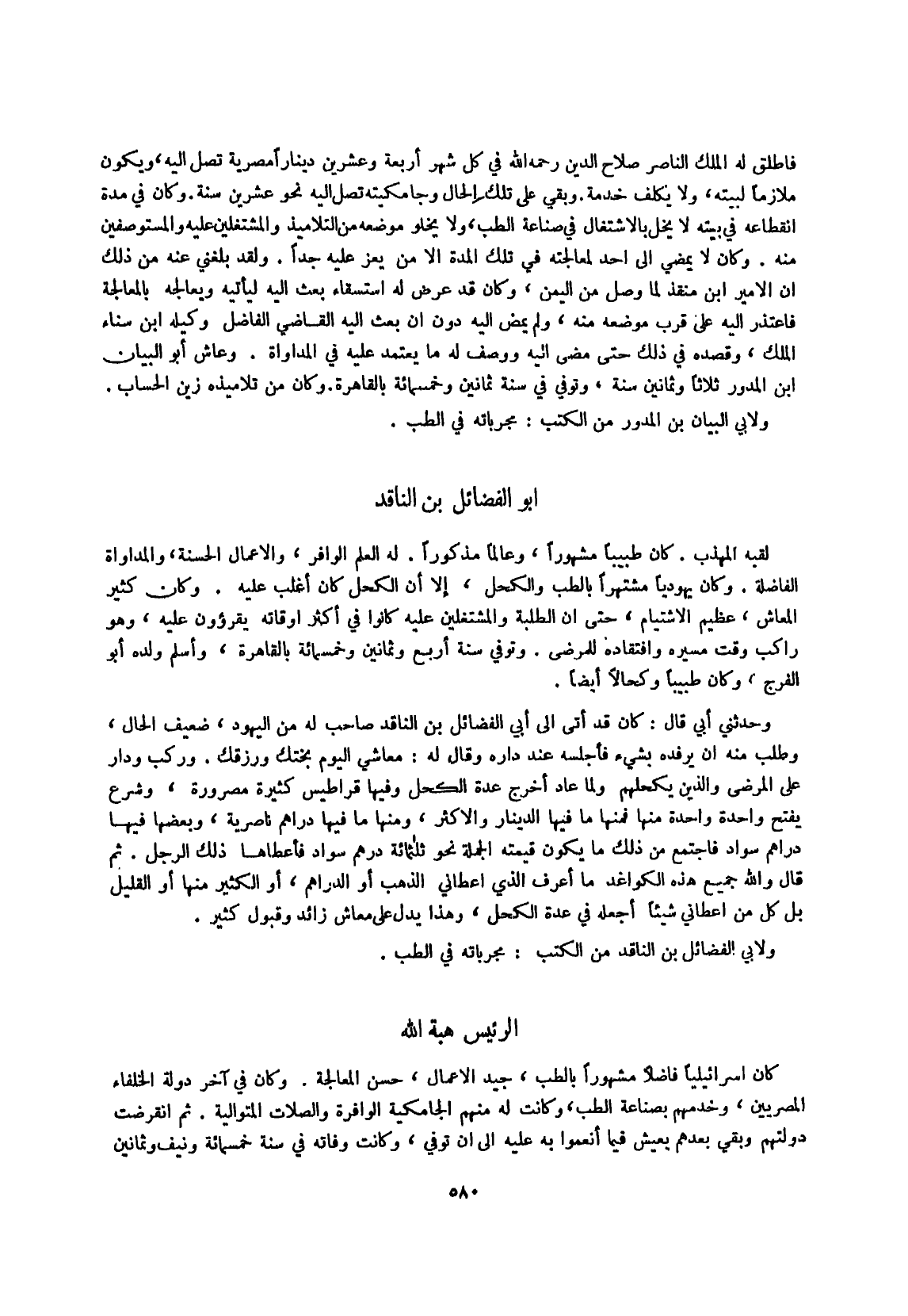 وَلَقَد بَلغنِي عَنهُ من ذل أَن الْأَمِير ابْن منقذ لما وصل من الْيمن وَكَانَ قد عرض لَهُ استسقاء بعث إِلَيْهِ ليَأْتِيه ويعالجه بالمعالجة فَاعْتَذر إِلَيْهِ على قرب مَوْضِعه مِنْهُ وَلم يمض إِلَيْهِ دون أَن بعث إِلَيْهِ القَاضِي الْفَاضِل وَكيله ابْن سناء الْملك وقصده فِي ذَلِك حَتَّى مضى إِلَيْهِ وَوصف لَهُ مَا يعْتَمد عَلَيْهِ فِي المداواة