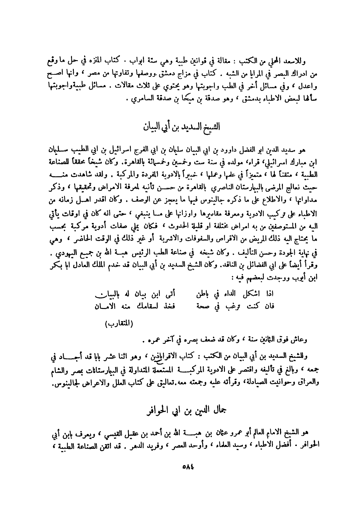 وللشيخ السديد بن أبي الْبَيَان من الْكتب كتاب الأقراباذين وَهُوَ اثْنَا عشر بَابا قد أَجَاد فِي جمعه وَبَالغ فِي تأليفه وَاقْتصر على الْأَدْوِيَة المركبة المستعملة المتداولة فِي البيمارستانات بِمصْر وَالشَّام وَالْعراق وحوانيت الصيادلة وقرأته عَلَيْهِ وَجمعته مَعَه