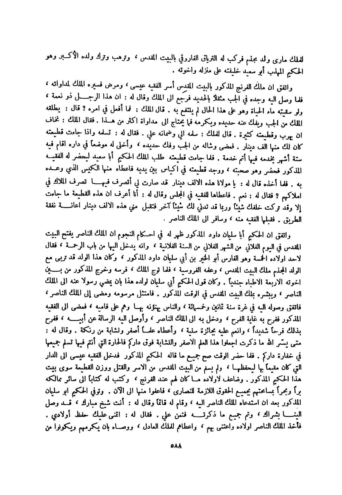 وَاتفقَ أَن الْحَكِيم أَبَا سُلَيْمَان دَاوُد الْمَذْكُور ظهر لَهُ فِي أَحْكَام النُّجُوم إِن الْملك النَّاصِر يفتح الْبَيْت الْمُقَدّس فِي الْيَوْم الْفُلَانِيّ من الشَّهْر الْفُلَانِيّ من السّنة الْفُلَانِيَّة وَأَنه يدْخل إِلَيْهَا من بَاب الرَّحْمَة فَقَالَ لأحد أَوْلَاده الْخَمْسَة وَهُوَ الْفَارِس أَبُو الْخَيْر بن أبي سُلَيْمَان دَاوُد الْمَذْكُور وَكَانَ هَذَا الْوَلَد قد تربى مَعَ الْوَلَد المجذم ملك الْبَيْت الْمُقَدّس وَعلمه الفروسية فَلَمَّا توج الْملك فرسه وَخرج الْمَذْكُور من بَين اخوته الْأَرْبَعَة الْأَطِبَّاء جنديا
