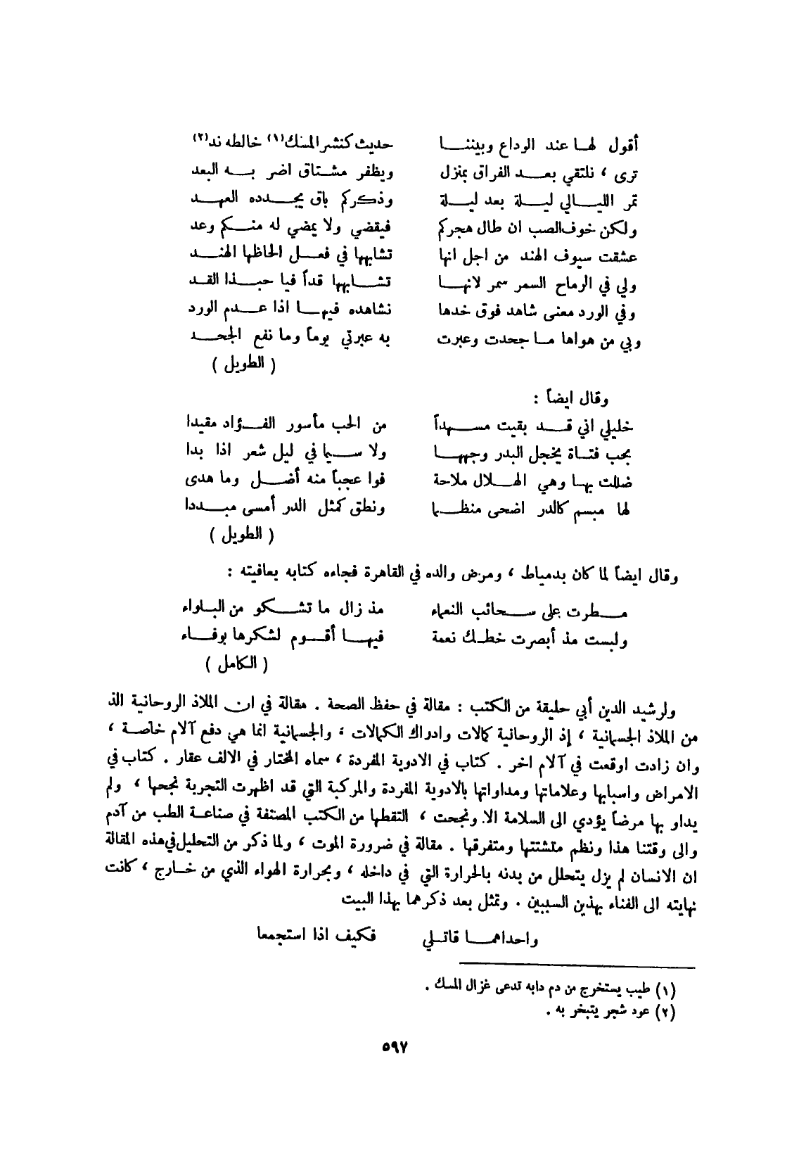 وَقَالَ أَيْضا لما كَانَ بدمياط وَمرض وَالِده فِي الْقَاهِرَة فَجَاءَهُ كِتَابه بعافيته
