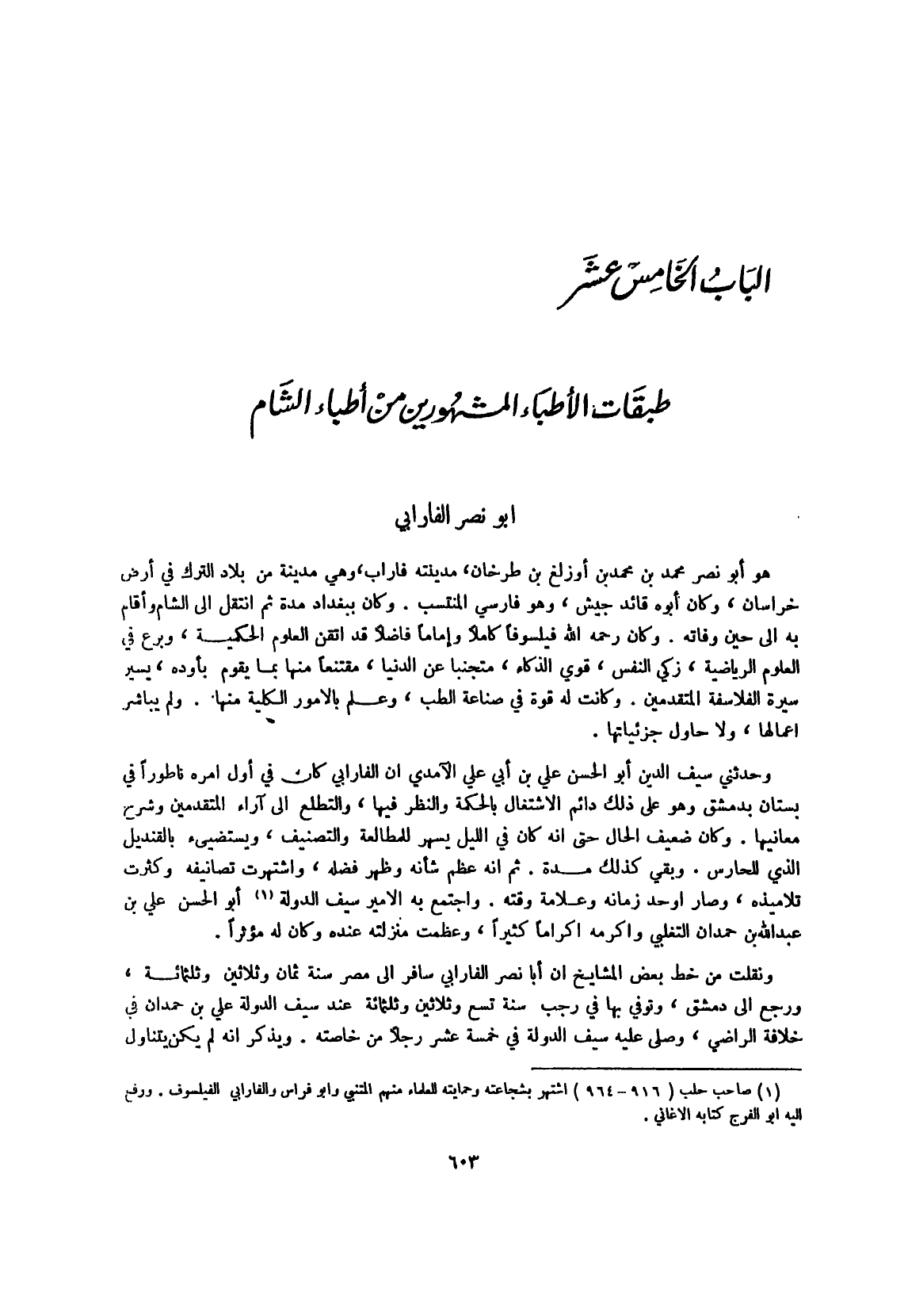 وحَدثني سيف الدّين أَبُو الْحسن عَليّ بن أبي عَليّ الْآمِدِيّ أَن الفارابي كَانَ فِي أول أمره ناطورا فِي بُسْتَان بِدِمَشْق وَهُوَ على ذَلِك دَائِم الِاشْتِغَال بالحكمة وَالنَّظَر فِيهَا والتطلع إِلَى آراء الْمُتَقَدِّمين وَشرح مَعَانِيهَا