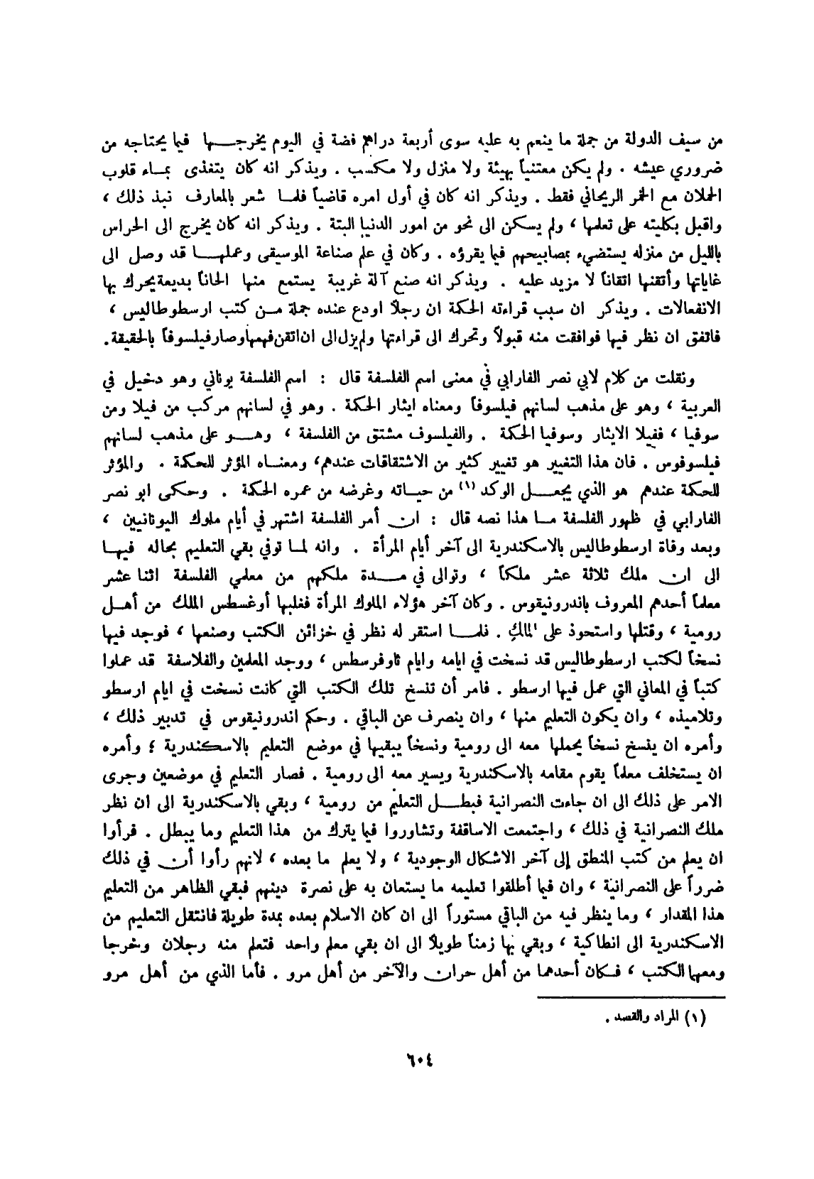 فَرَأَوْا أَن يعلم من كتب الممطق إِلَى آخر الأشكال الوجودية وَلَا يعلم مَا بعده لأَنهم رَأَوْا أَن فِي ذَلِك ضَرَرا على النَّصْرَانِيَّة وَأَن فِيمَا أطْلقُوا تَعْلِيمه مَا يستعان بِهِ على نصْرَة دينهم فَبَقيَ الظَّاهِر من التَّعْلِيم هَذَا الْمِقْدَار وَمَا ينظر فِيهِ من الْبَاقِي مَسْتُورا إِلَى أَن كَانَ الْإِسْلَام بعده بِمدَّة طَوِيلَة فانتقل التَّعْلِيم من الْإسْكَنْدَريَّة إِلَى أنطاكية وَبَقِي بهَا زَمنا طَويلا إِلَى أَن بَقِي معلم وَاحِد فتعلم مِنْهُ رجلَانِ وخرجا ومعهما الْكتب فَكَانَ أَحدهمَا من أهل حران وَالْآخر من أهل مرو